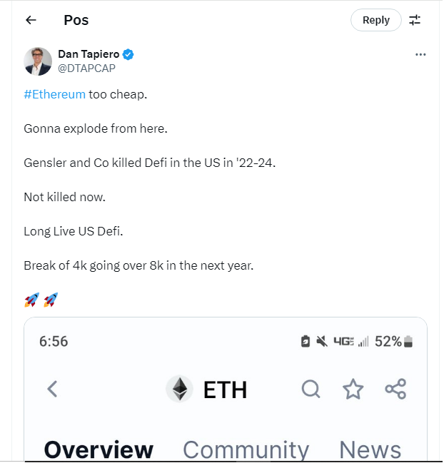 Founder 10T Holdings, Dan Tapiero melalui utas X (Twitter) mengatakan, harga Ethereum saat ini masih terlalu murah dan pergerakannya akan meledak dari sekarang.