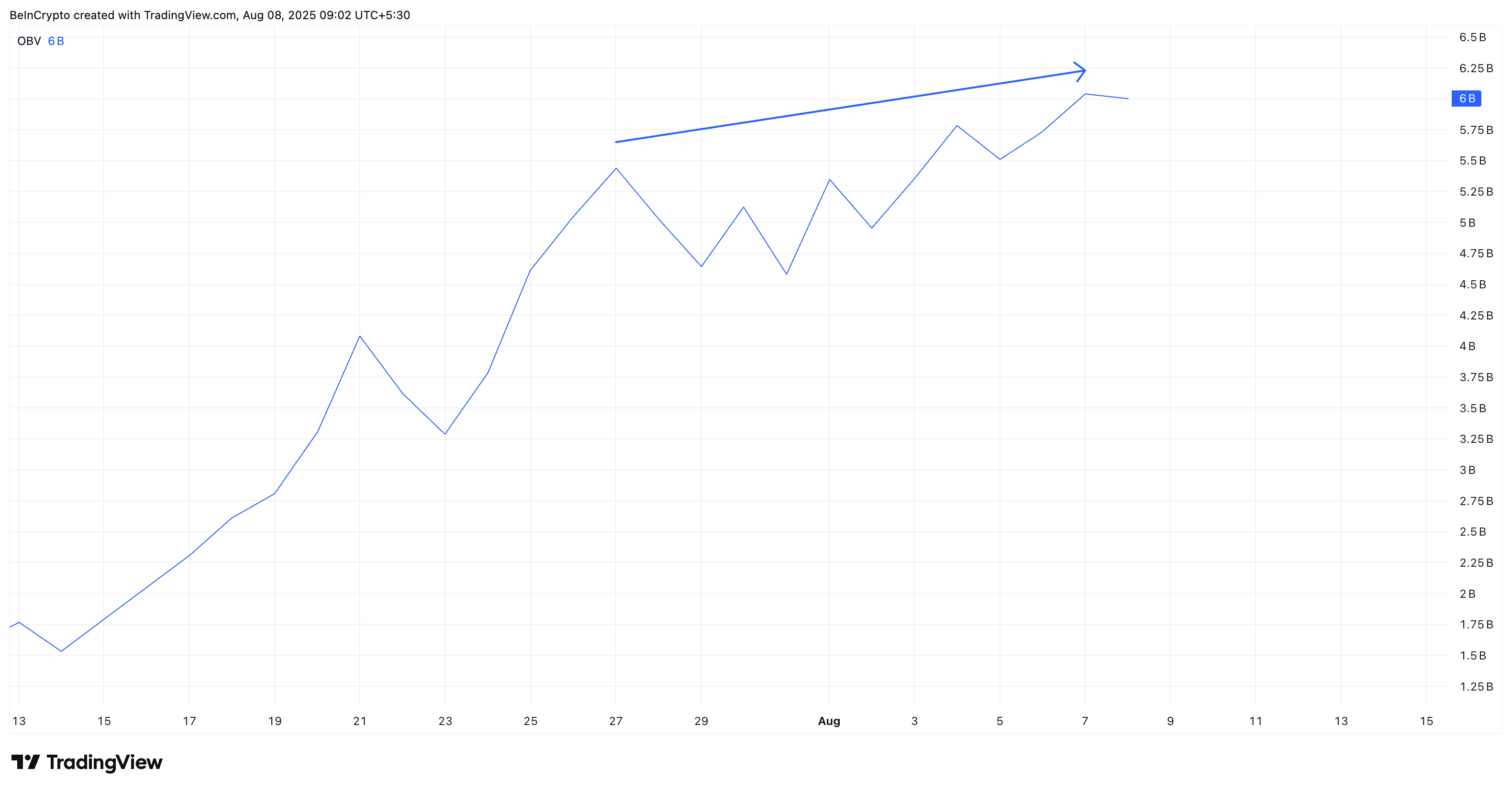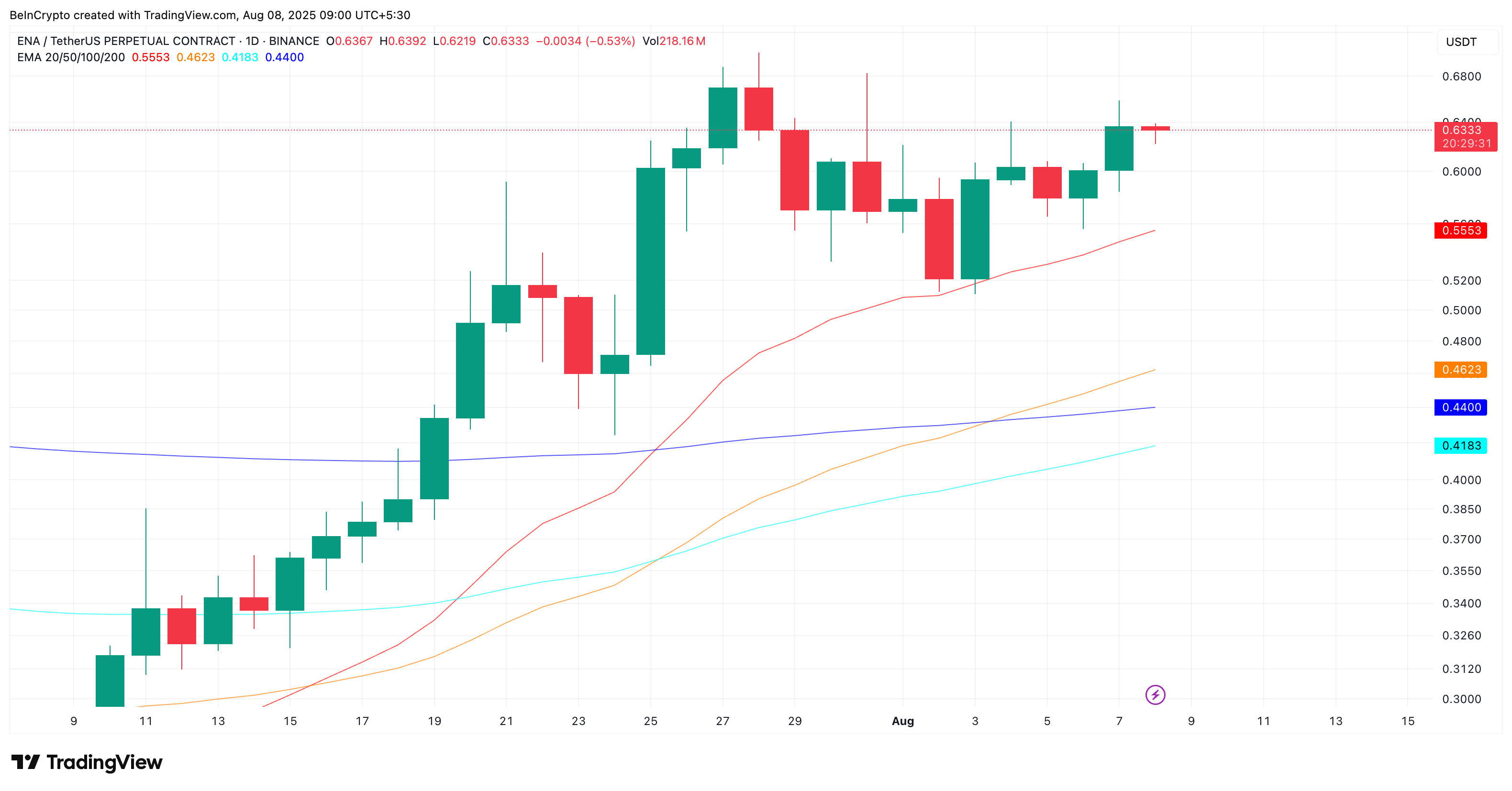 SponsoredIndikator On-Balance Volume (OBV) menambah bobot pada pergerakan. Pada 28 Juli, ENA membuat harga tertinggi yang lebih tinggi, dan pada 7 Agustus, mencetak harga tertinggi yang lebih rendah. Namun, OBV membuat harga tertinggi yang lebih tinggi selama periode ini, divergensi bullish yang menunjukkan tekanan beli sedang membangun di bawah permukaan.