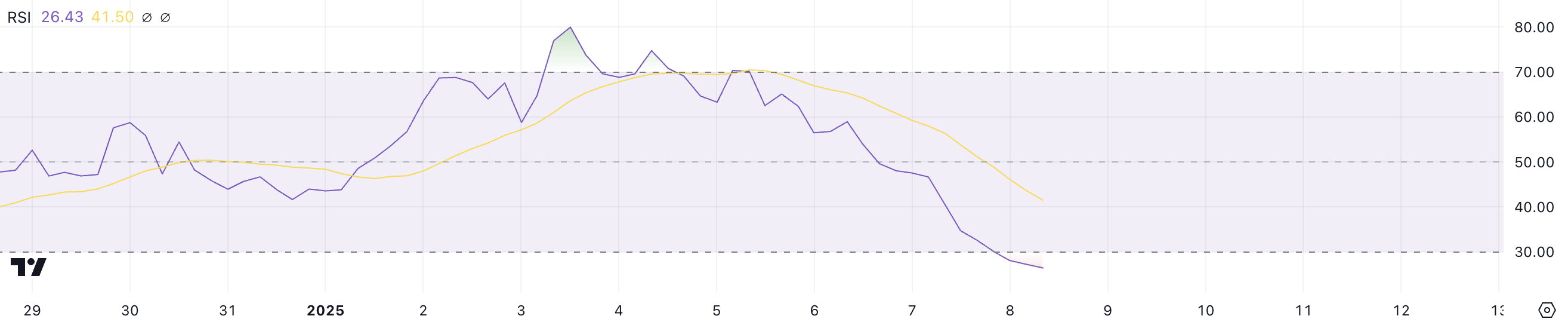 Bacaan di atas 70 menunjukkan kondisi overbought dan potensi koreksi harga, sementara nilai di bawah 30 menunjukkan kondisi oversold dan kemungkinan pemulihan harga. Penurunan tajam dari 79,9 pada 3 Januari ke level saat ini mencerminkan perubahan signifikan dalam sentimen pasar, dengan tekanan jual yang berat mendominasi selama lima hari terakhir.