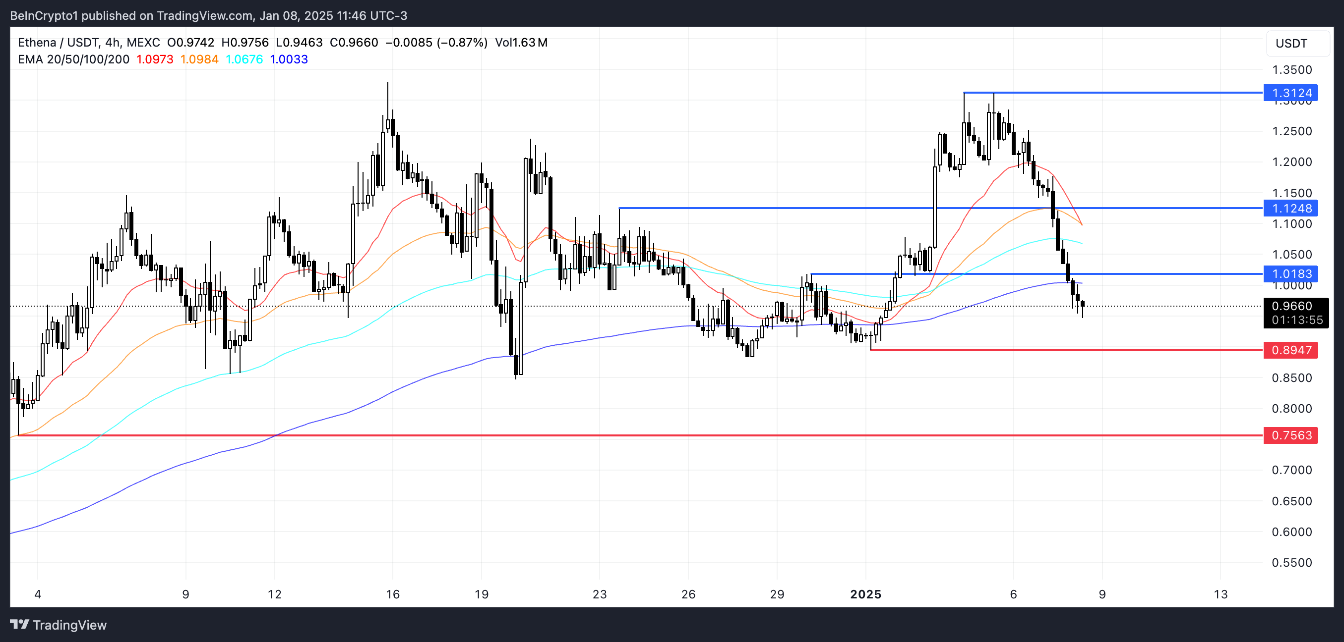 Garis EMA ENA saat ini menunjukkan setup bearish, dengan garis jangka pendek bergerak ke bawah. Jika pergerakan ini berlanjut, bisa mengarah pada pembentukan death cross. Sinyal teknis ini terjadi ketika EMA jangka pendek melintasi di bawah EMA jangka panjang, sering kali menunjukkan momentum penurunan lebih lanjut.