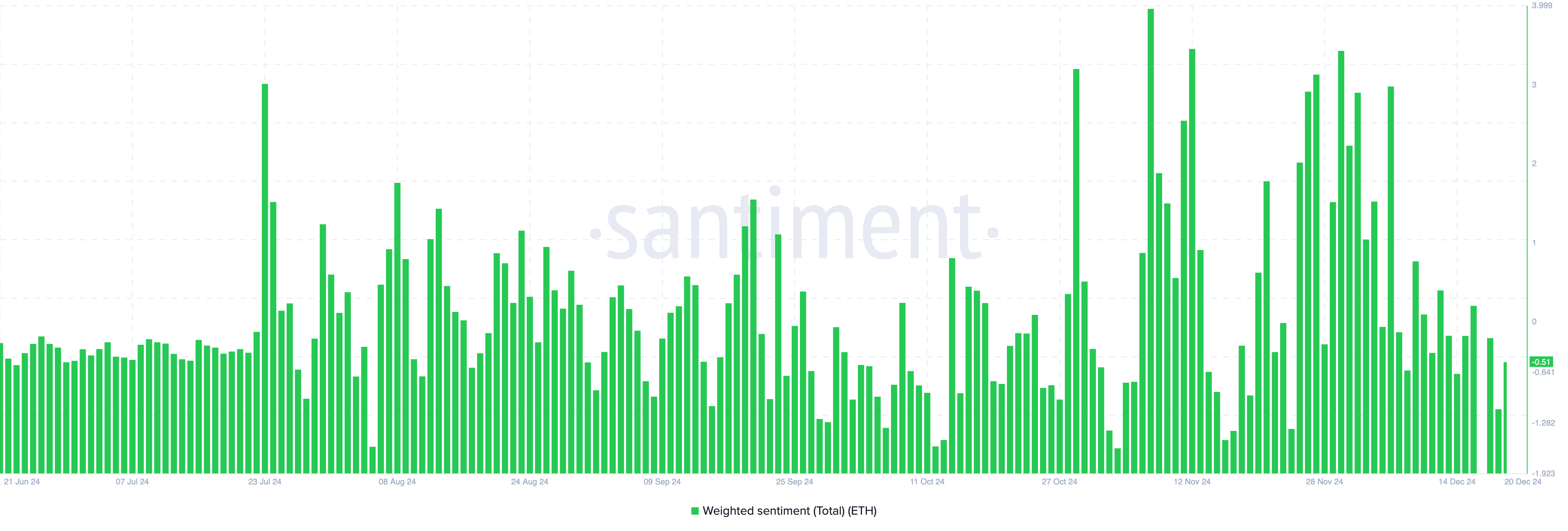 Indikator Sentimen Tertimbang menunjukkan harga Ethereum bisa terus naik. Metrik ini mengukur persepsi pasar secara keseluruhan terhadap aset kripto, dengan pembacaan positif mencerminkan sentimen bullish dan pembacaan negatif menunjukkan sentimen bearish.