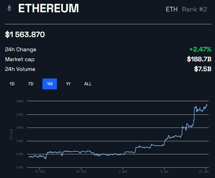 Harga penutupan Ethereum berada di level US$1.600 pada pagi hari tanggal 16 Januari. Memberikan kontribusi yang lebih lanjut pada kenaikannya di akhir pekan, ETH berhasil menyentuh harga tertingginya sejak tanggal 8 November, dan mencapai US$1.589 pagi ini.