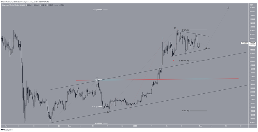 Ada dua skenario yang bakal terjadi pada sisa pergerakannya di gelombang empat. Peluang terbesarnya adalah harga ETH akan berkonsolidasi di dalam pola segitiga simetris dalam 24 jam ke depan sebelum melangsungkan aksi breakout. Baru setelah itu, target utamanya yaitu untuk mencapai level US$1.810 yang diciptakan oleh perpanjangan gelombang kesatu 2,61 (putih).
