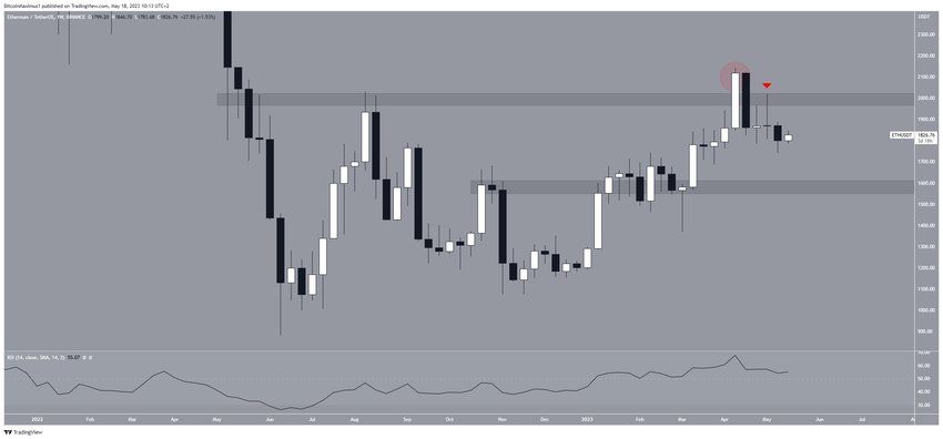 Pada awal April, harga Ethereum berhasil mencetak level tertinggi tahunannya di level US$2.151, dan tampaknya bergerak di atas area resistance US$1.950. Namun, setelah mengalami penurunan yang signifikan pada minggu berikutnya, harga ETH terperosok di bawah area tersebut dan memvalidasinya sebagai resistance (ikon merah).