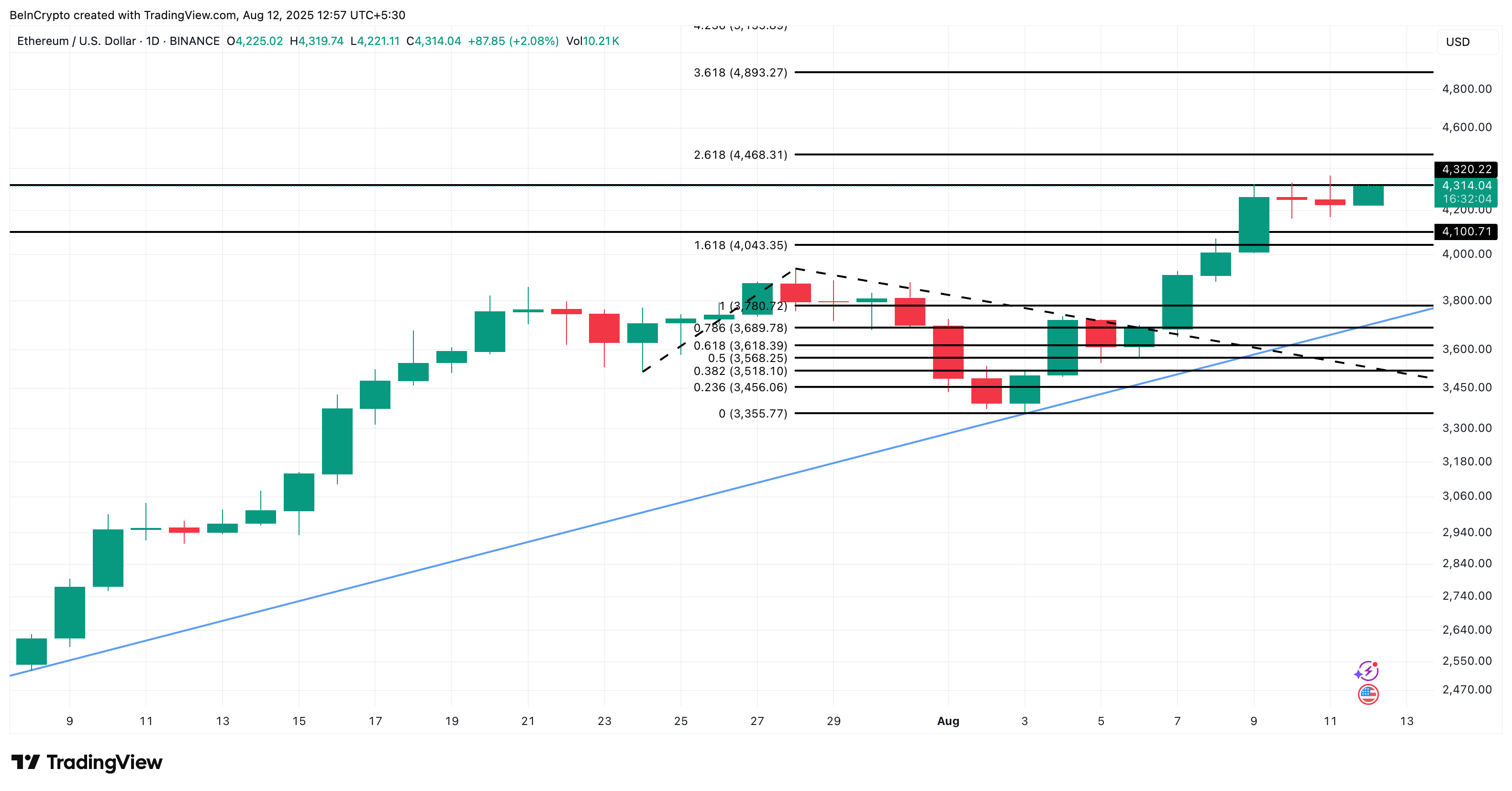 Dari perspektif teknis, Ethereum diperdagangkan dalam pola kelanjutan bullish (segitiga naik), dengan resistance kunci di US$4.468, ekstensi Fibonacci 2,618 dari reli terbarunya.