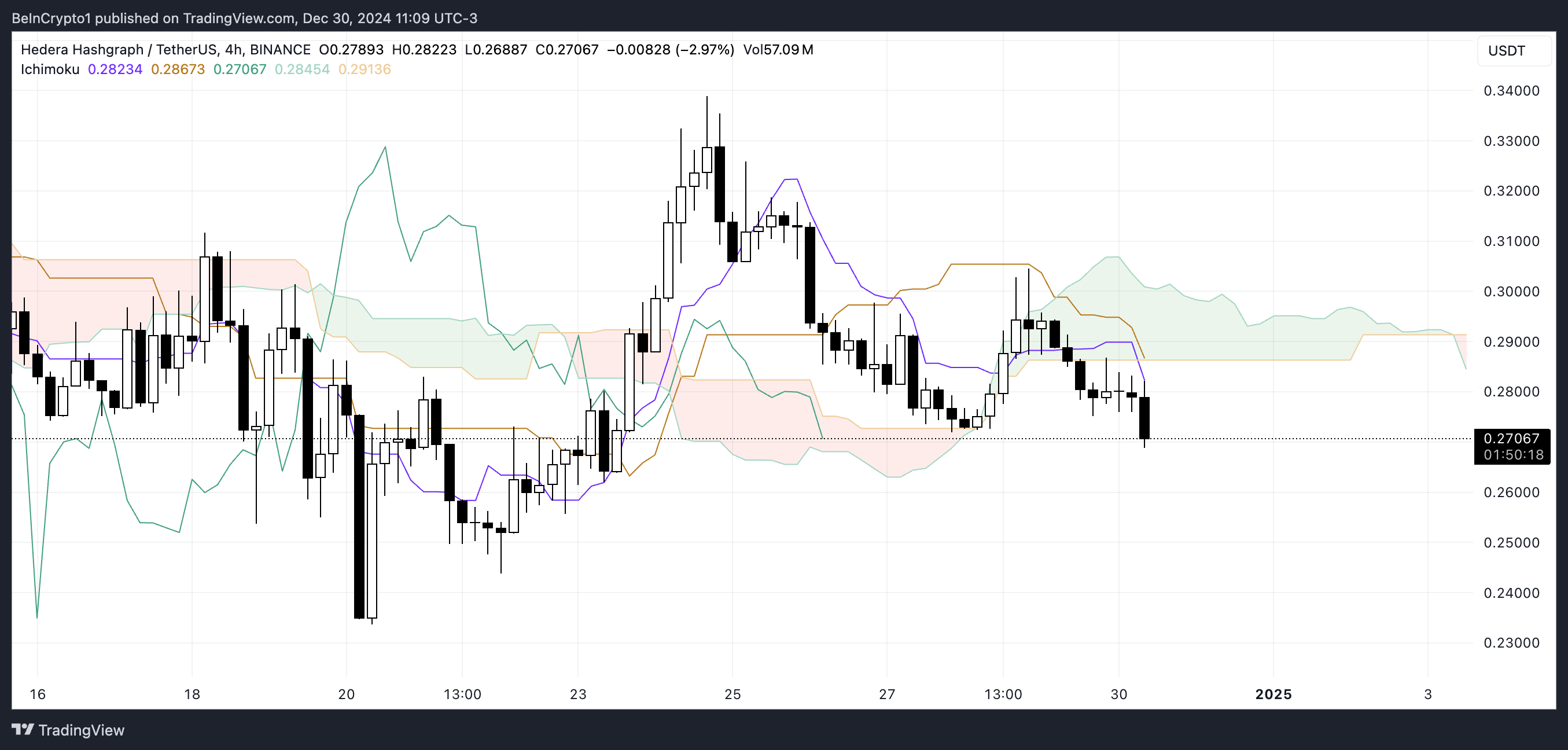 Span tertinggal berwarna hijau (Chikou Span) juga berada di bawah aksi harga dan awan. Alhasil, ini semakin mengonfirmasi dominasi kondisi bearish. Secara keseluruhan, konfigurasi Ichimoku menunjukkan bahwa HBAR kemungkinan akan tetap berada dalam tren turun kecuali mampu menembus ke atas awan, yang akan menandakan potensi pembalikan arah alias reversal.