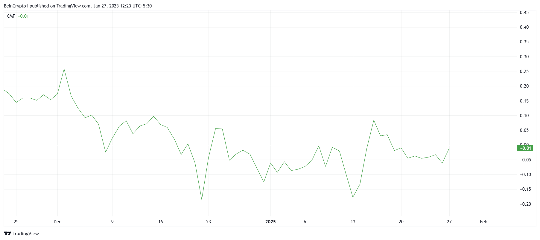 Momentum makro HBAR tetap tidak menginspirasi, seperti terlihat dari indikator Chaikin Money Flow (CMF) yang kesulitan untuk menutup di atas garis nol. Situasi ini menunjukkan bahwa arus keluar mendominasi pasar, dengan arus masuk terbatas untuk mengimbangi tekanan jual. Ketidakseimbangan ini menyoroti kurangnya kepercayaan investor pada kemampuan HBAR untuk breakout dari konsolidasi.