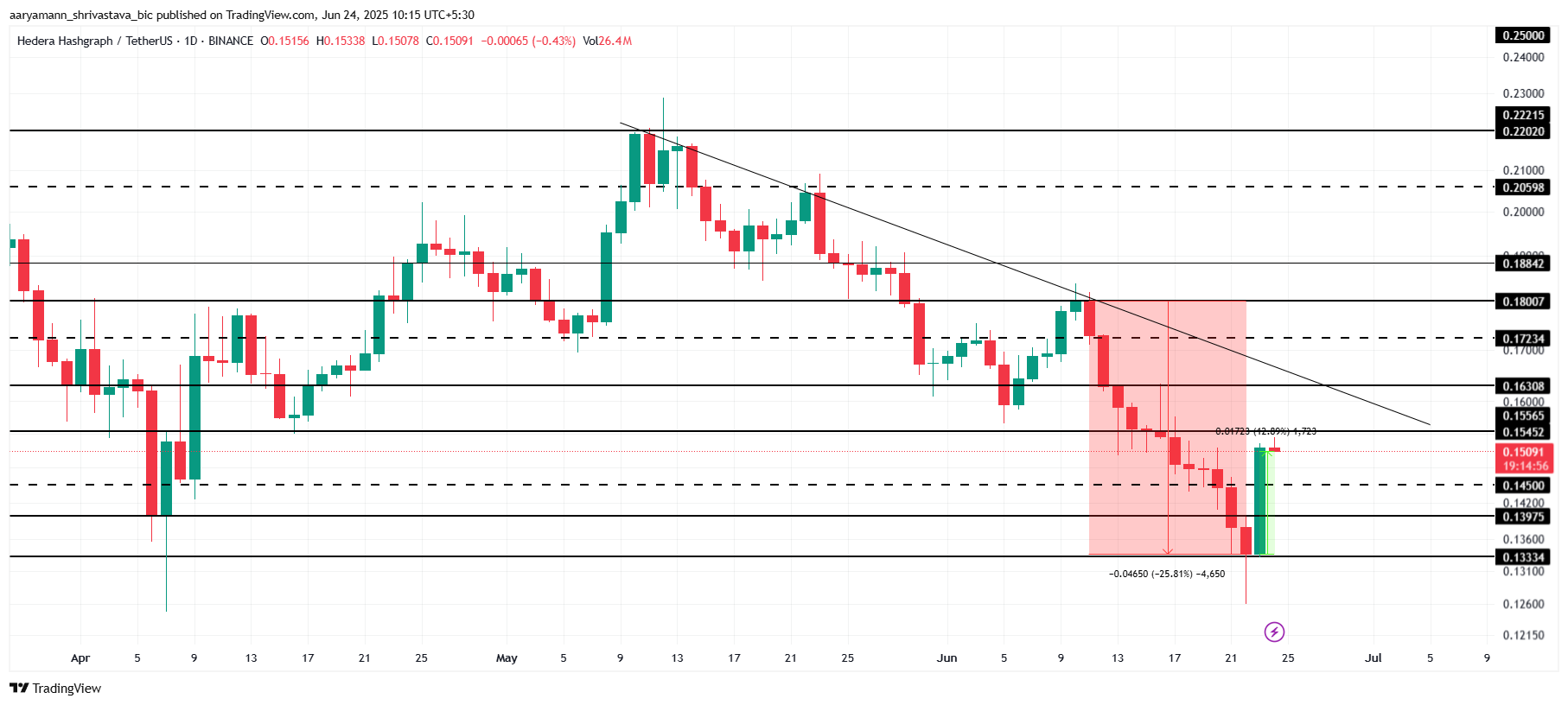 Namun, jika momentum bullish gagal bertahan, ada risiko bahwa HBAR bisa mundur. Jika harga jatuh kembali di bawah level support kunci, mungkin akan turun ke sekitar US$0,139 atau bahkan US$0,133. Penurunan seperti itu akan menunjukkan bahwa pemulihan hanya sementara, dan sentimen bearish bisa kembali.