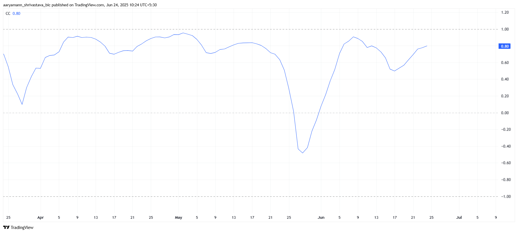 Pergerakan harga HBAR sangat berkorelasi dengan Bitcoin, dengan koefisien korelasi yang kuat sebesar 0,80. Korelasi tinggi ini menunjukkan bahwa HBAR bisa meniru pergerakan harga Bitcoin, memanfaatkan potensi pertumbuhan Bitcoin. Jika Bitcoin melanjutkan tren naiknya, HBAR juga bisa memanfaatkan momentum positif pasar kripto yang lebih luas, menghasilkan keuntungan bagi altcoin ini.