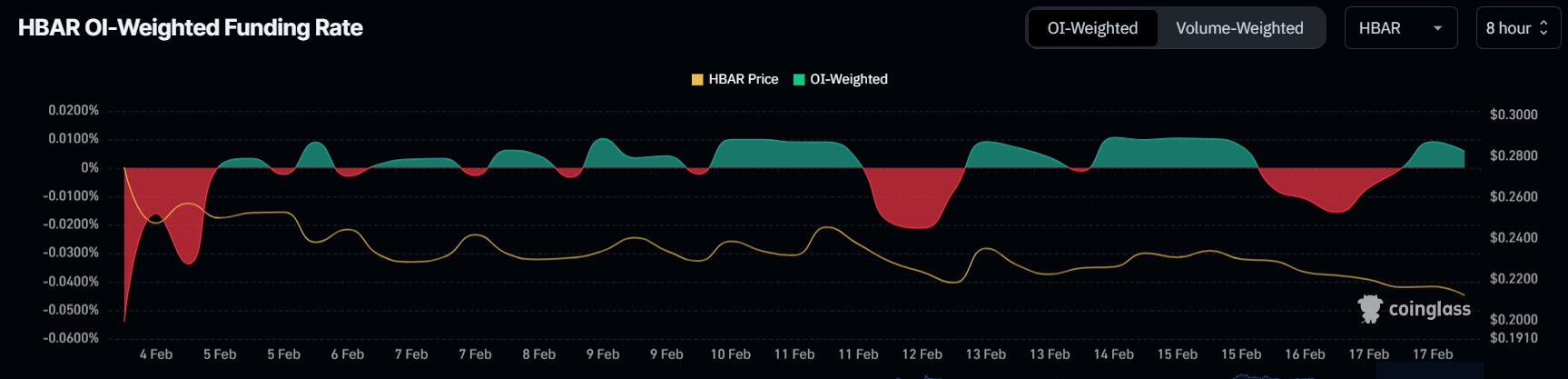Funding rate untuk trader HBAR saat ini bergerak fluktuatif. Menunjukkan ketidakpastian tentang langkah token selanjutnya. Para trader silih berganti antara kontrak short dan long, mencerminkan keraguan mereka.