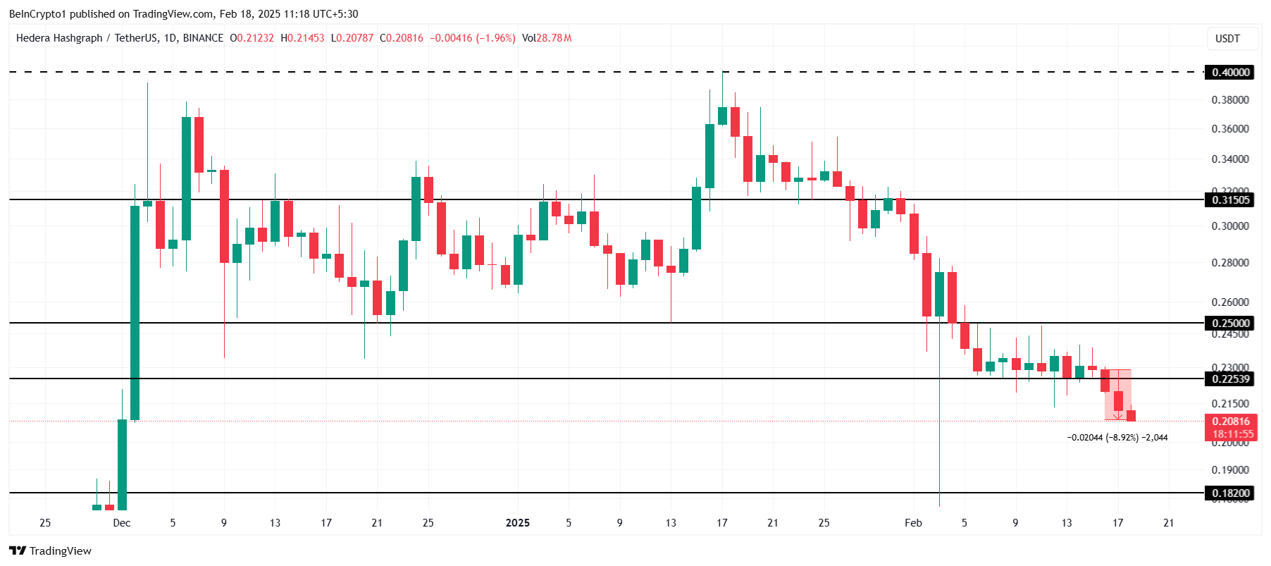 Harga HBAR telah turun 8% dalam 48 jam terakhir, menembus di bawah konsolidasi yang terbentuk selama dua minggu terakhir. Bergerak pada US$0,208, altcoin ini kehilangan beberapa dukungan, dan pergerakan turun lebih lanjut nampaknya mungkin terjadi dalam jangka pendek. Perubahan aksi harga ini menandakan perlunya level dukungan yang kuat untuk menghindari kerugian lebih lanjut.