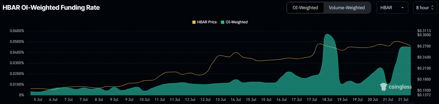 Trader nampaknya optimistis terhadap HBAR, terbukti dari konsistensi positif funding rate-nya. Selama lebih dari sebulan, rate ini tetap positif. Dua kali minggu ini, funding rate melonjak, menandakan dominasi posisi long.