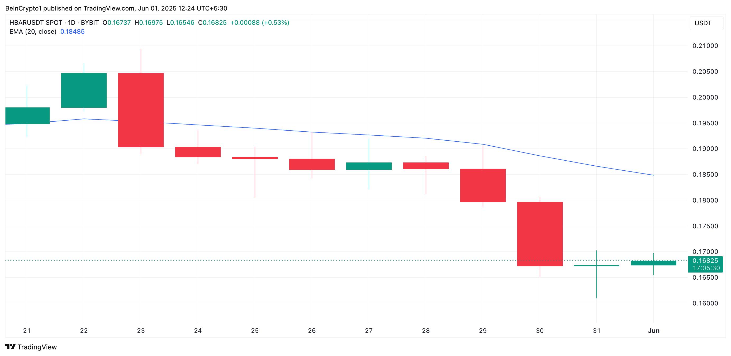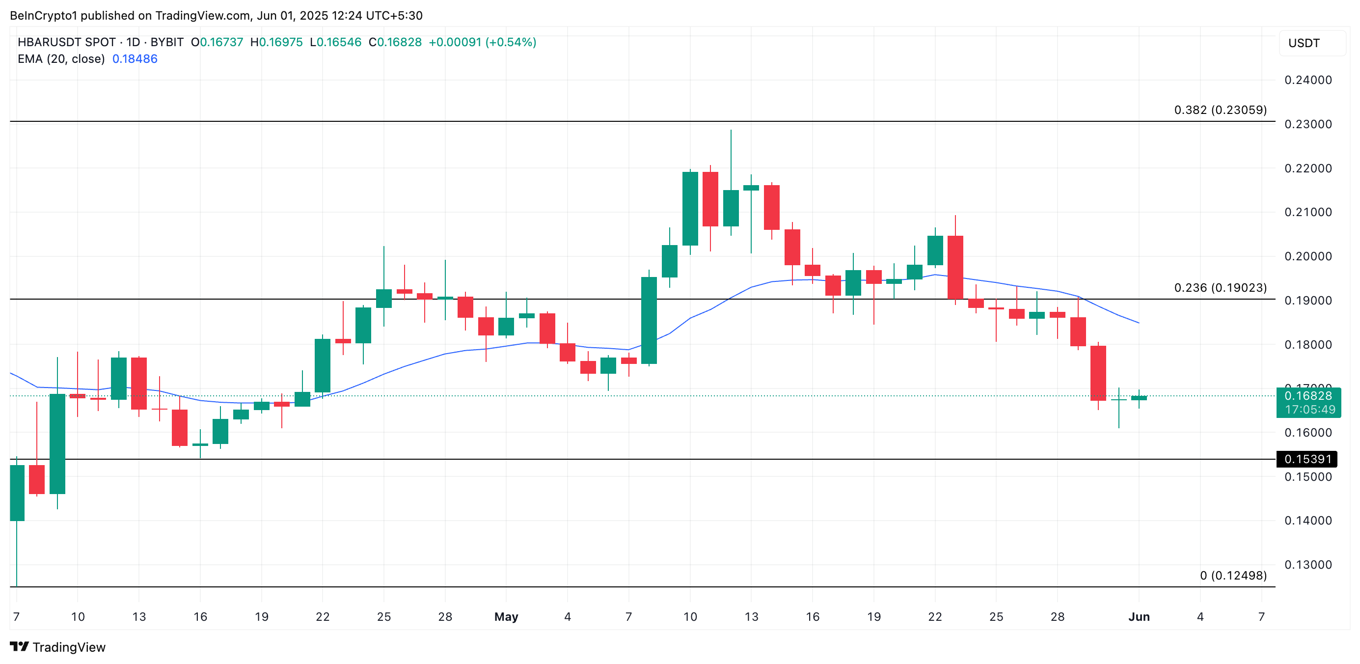 Penurunan aktivitas perdagangan aset kripto secara keseluruhan minggu lalu membuat native token Hedera, HBAR, jatuh ke level terendah 30 hari di US$0,16 pada 31 Mei. Meskipun token ini berhasil naik sekitar 3% dalam 24 jam terakhir, pemulihan ini mungkin tidak menandakan pembalikan bullish yang sebenarnya.