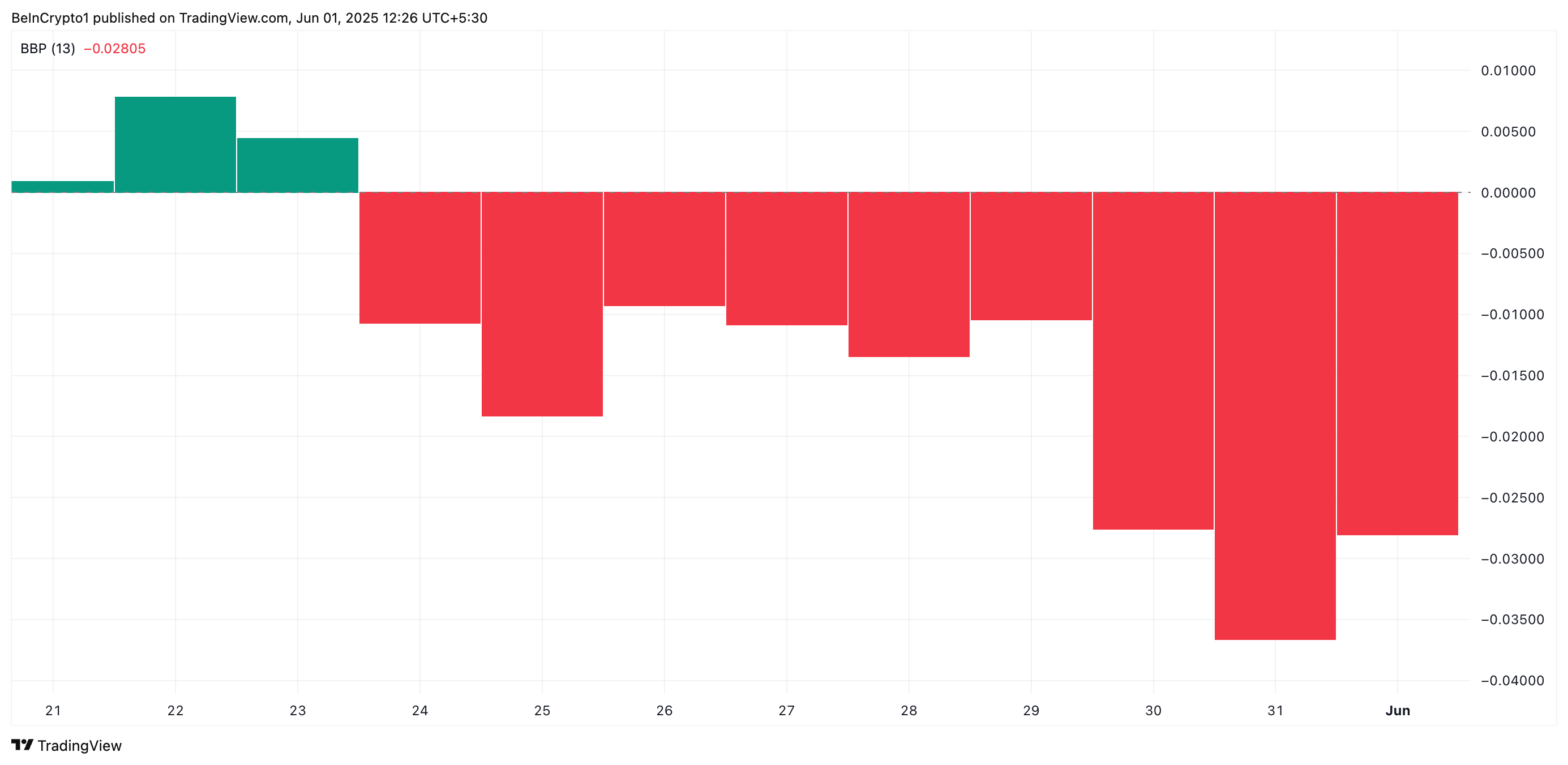 Indikator ini terus-menerus mengembalikan nilai negatif sejak 24 Mei, menyoroti kurangnya kekuatan bullish bahkan selama kenaikan harga baru-baru ini.