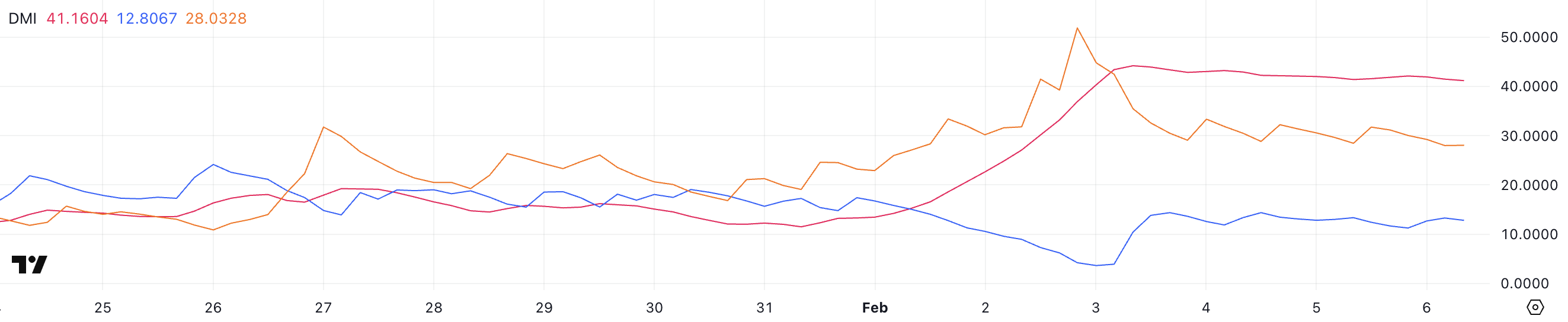 Hedera ADX saat ini berada di 41,1, tetap di atas 40 selama tiga hari terakhir dan mencapai puncak di 44,1 pada 3 Februari. Average Directional Index (ADX) mengukur kekuatan tren, dengan pembacaan di atas 25 menunjukkan tren kuat dan nilai lebih rendah menunjukkan kelemahan.