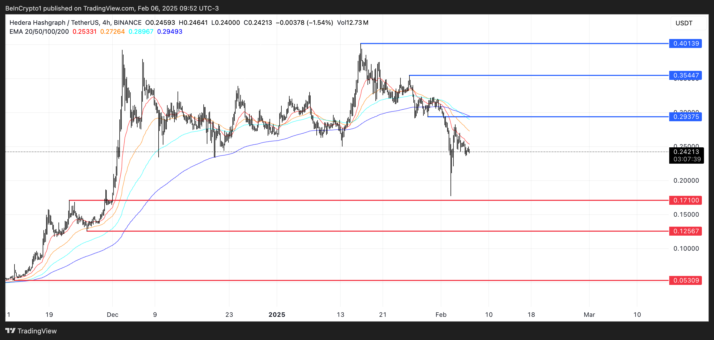 Breakout di atas level ini bisa mendorong harga menuju US$0,35. Jika momentum bullish menguat, HBAR bisa naik hingga US$0,40, potensi kenaikan 65%. Namun, sampai EMA beralih ke alignment yang lebih bullish, tren yang berlaku tetap bearish.