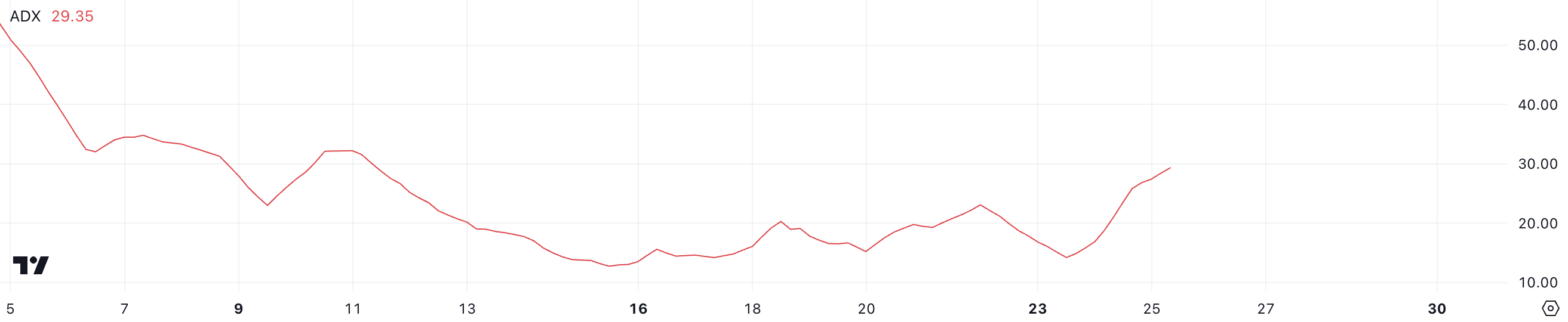 HBAR Average Directional Index (ADX) saat ini berada di 29,35, menandai kenaikan signifikan dari 15 hanya dua hari yang lalu. Peningkatan tajam ini mencerminkan momentum tren yang menguat, mengonfirmasi bahwa tren naik saat ini semakin mendapatkan daya tarik.