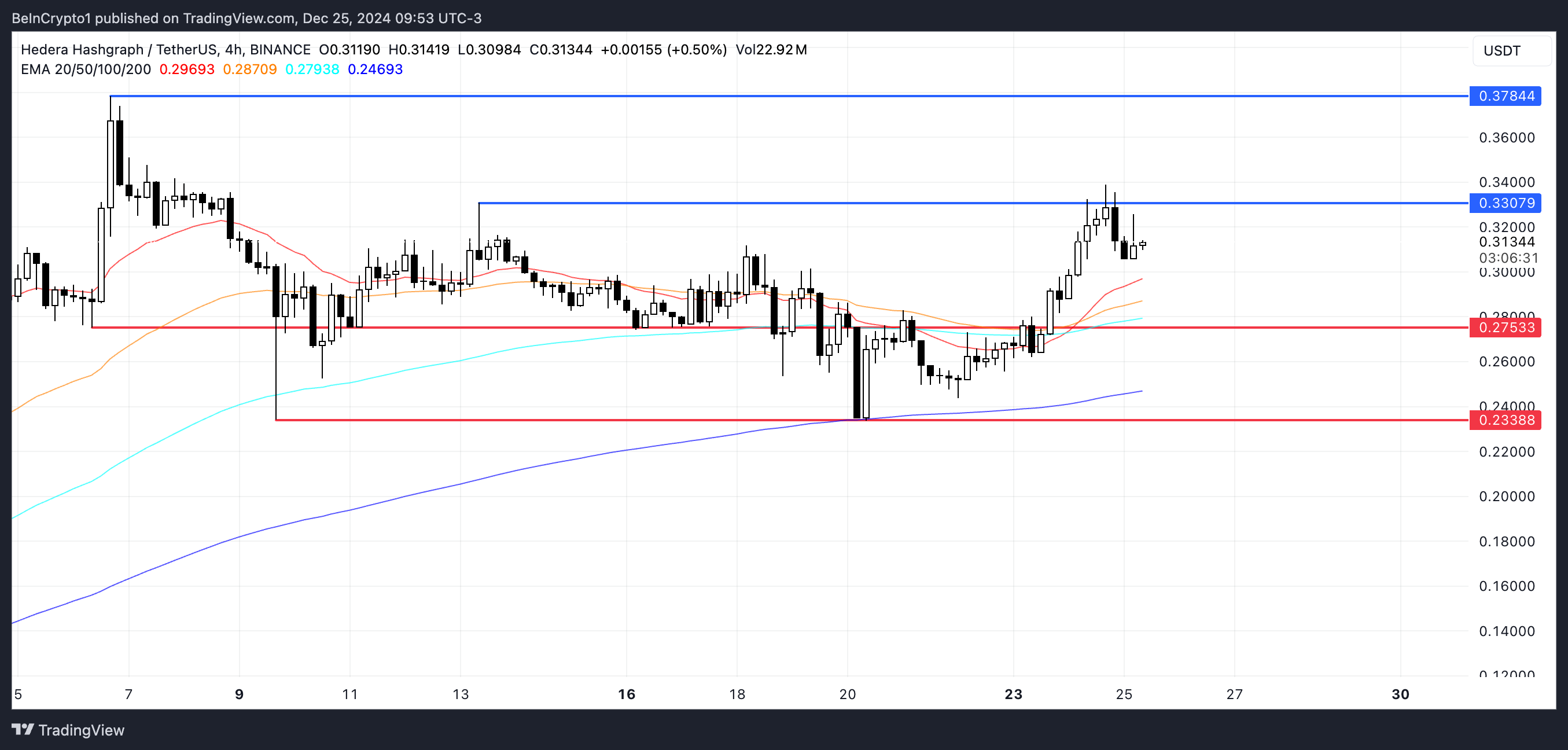 HBAR baru-baru ini membentuk golden cross pada 24 Desember, dengan EMA jangka pendek melintasi di atas EMA jangka panjang, menandakan potensi pembalikan tren bullish.