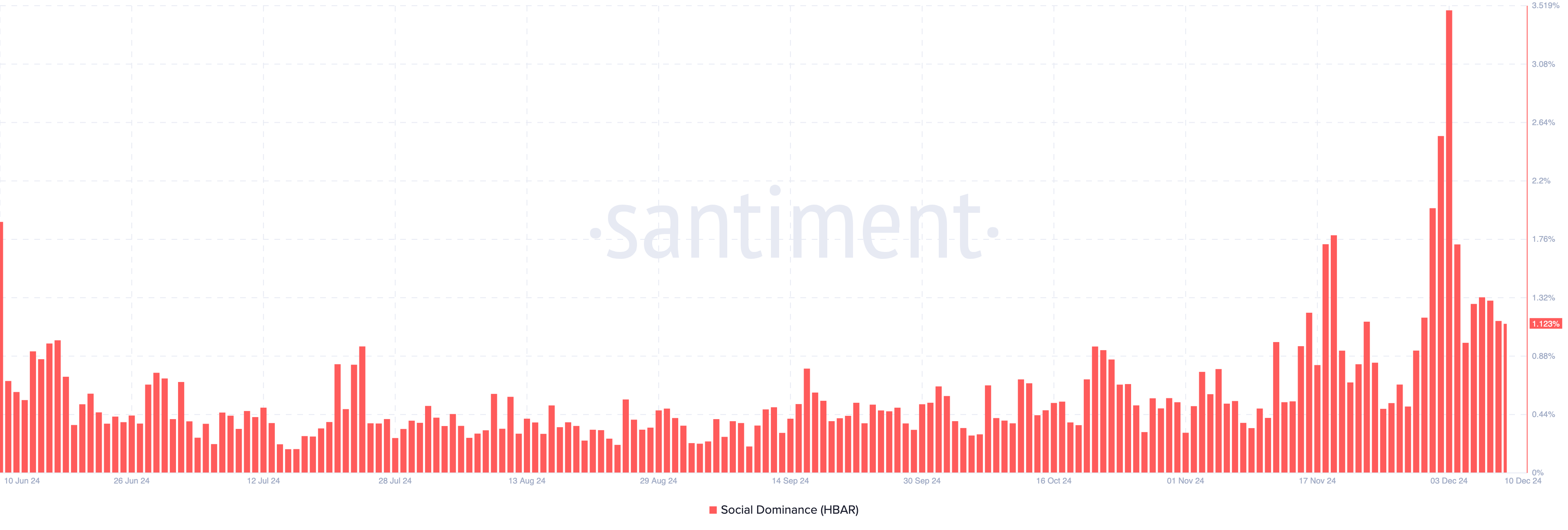 Pada 3 Desember, dominasi sosial HBAR melonjak menjadi 3,50%. Namun, sejak itu turun menjadi 1,12%, mencerminkan penurunan tajam dalam perhatian terhadap altcoin ini. Jika tren ini berlanjut, ini bisa menyebabkan penurunan harga lebih lanjut.