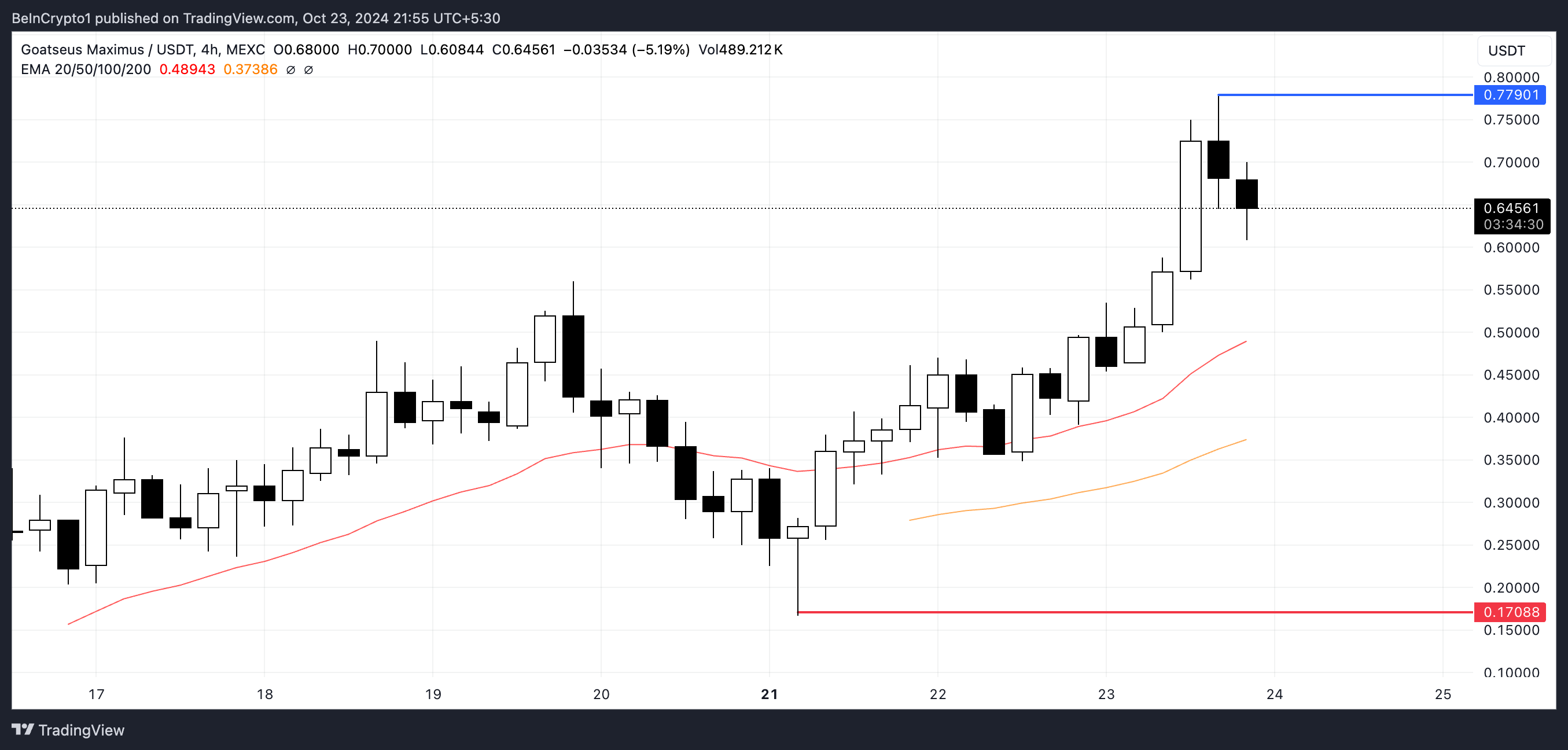 Perbedaan lebar antara harga saat ini dan support menyoroti pentingnya mempertahankan tren bullish yang sedang berlangsung. Jika itu tidak terjadi, GOAT bisa menghadapi penurunan tajam jika tekanan jual meningkat.
