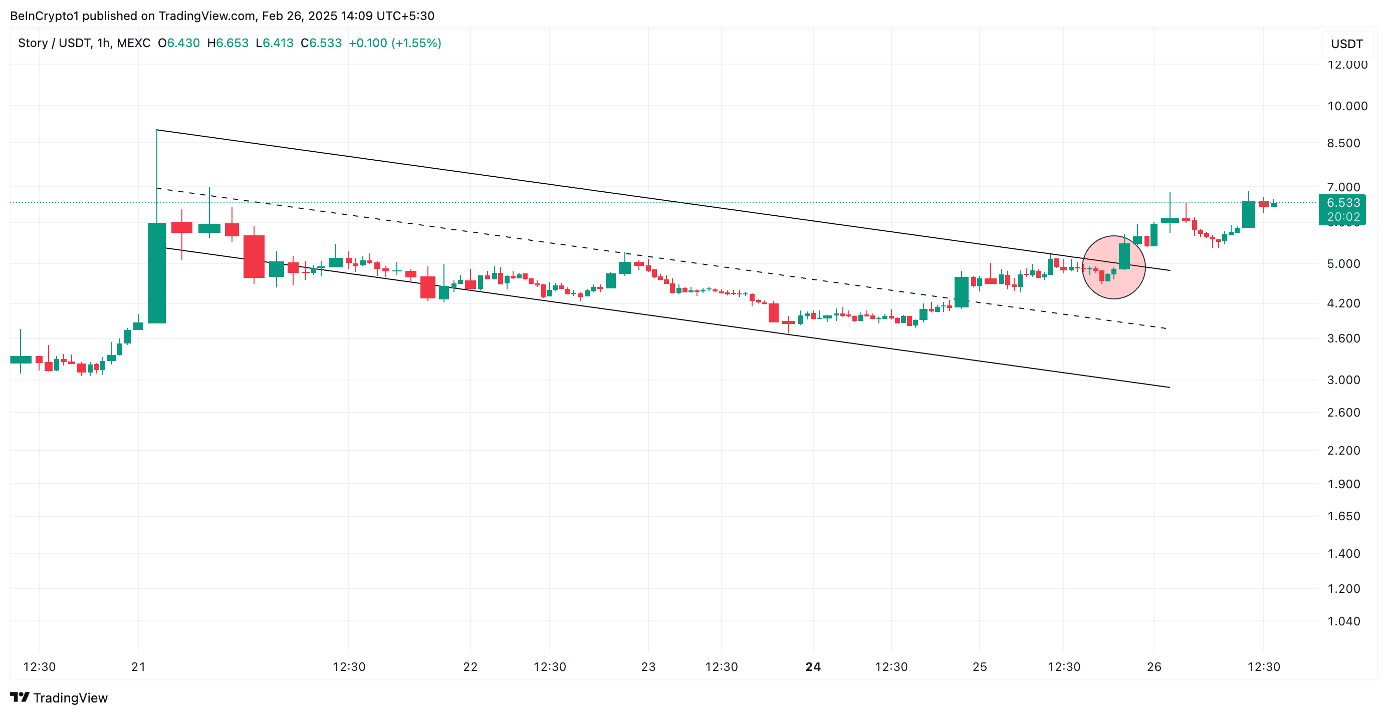 Pada grafik per jam, IP telah mengubah resistance di US$6 menjadi lantai support. Jika level ini bertahan dan permintaan untuk altcoin terus tumbuh, IP bisa reli menuju harga tertinggi sepanjang masa di US$9.