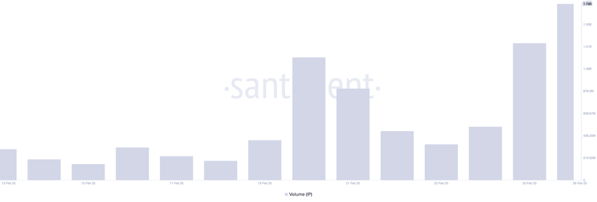 Hal ini terjadi pada IP selama 24 jam terakhir. Volume perdagangannya melonjak 197% selama periode tersebut. Saat ini, volume perdagangan mencapai titik tertinggi sepanjang masa sebesar US$1,73 miliar, mencerminkan permintaan tinggi untuk altcoin ini.