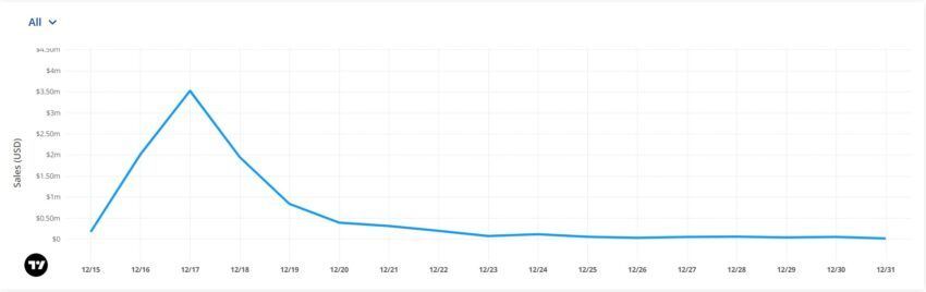 Selain itu, tak hanya harga dasarnya yang turun. Namun, jumlah penjualan hariannya pun turun 99% dari waktu puncaknya. Kondisi ini menunjukkan bahwa momentumnya sudah pudar. Data dari CryptoSlam juga mengungkapkan bahwa penjualan koleksi NFT Donald Trump telah turun 39% dalam 24 jam terakhir, yakni menjadi US$45.470 dari 170 transaksi. Lalu, data tersebut menampilkan pula bahwa volume penjualan selama satu minggu sudah menyusut 94% dan saat ini nilainya berkisar US$386.170.