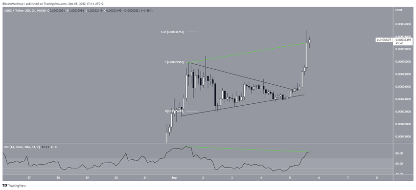 Selanjutnya, indikator RSI dengan timeframe enam jam menghasilkan pola divergensi bearish di dalam zona overbought. Akibatnya, akan terjadi pertemuan level resisten di area US$0,00034 dan indikator teknikal ini menunjukkan kelesuan pada harga LUNC.