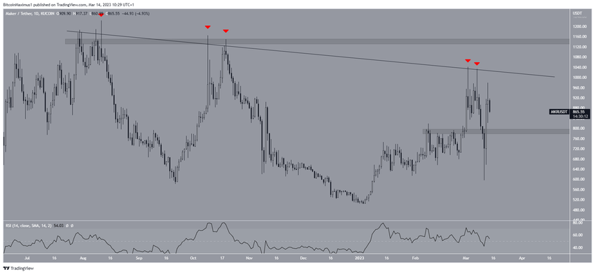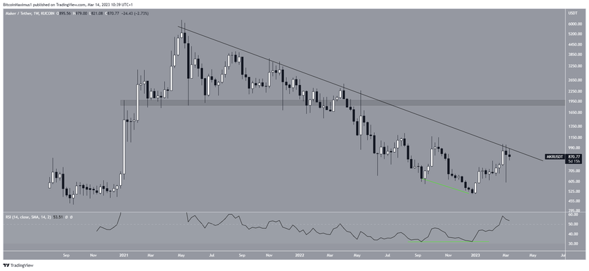 Harga MKR telah turun di bawah garis descending resistance jangka panjang sejak mencapai harga tertingginya sepanjang masa (ATH) pada bulan Maret lalu. Penurunan tersebut telah menyebabkan harganya ambruk hingga mencapai level terendah US$504 pada bulan Desember.