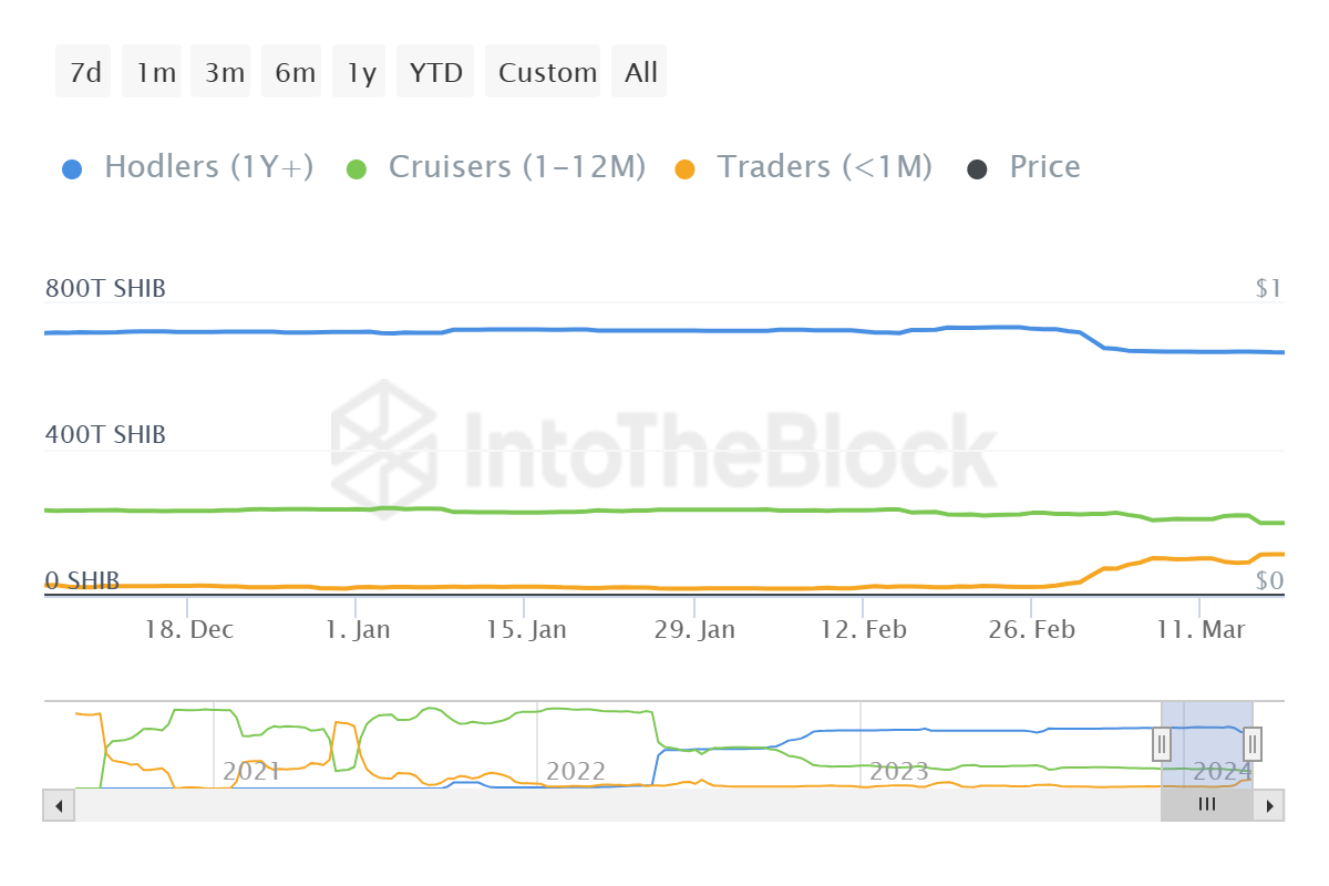 Selanjutnya, sebagian besar pasokan baru saja berpindah ke tangan holder jangka pendek. Para holder ini cenderung menyimpan aset mereka kurang dari sebulan. Alhasil, ini membuat mereka rentan terhadap aksi jual dadakan. Selama empat hari terakhir saja, lebih dari 23 triliun SHIB senilai US$582 juta terekam berpindah ke kelompok wallet ini. Sehingga mempertajam potensi koreksi harga akibat aksi ambil untung (profit taking).