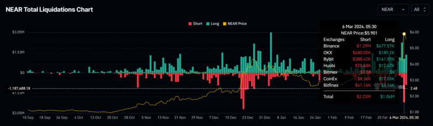 Lonjakan harga NEAR yang terjadi Rabu, 6 Maret lalu sukses menorehkan efek bullish yang kuat setelah naik tajam di grafik harian. Tak ayal, reli ini pun menjadi pukulan bagi para bear yang mengantisipasi terjadinya penurunan.