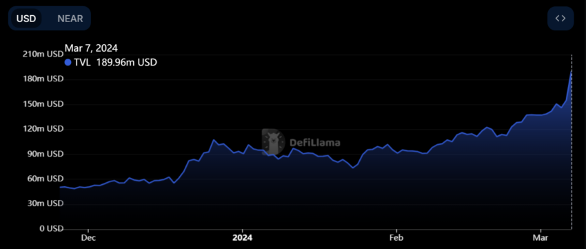 Tidak hanya spekulasi, jumlah penggunaan protokol faktanya juga mengukir kenaikan. Di tengah kenaikan harga pada hari Rabu, total value locked (TVL) NEAR Protocol tercatat melejit sebanyak 22,5% dari US$155 juta ke angka US$189 juta dalam kurun waktu 24 jam.