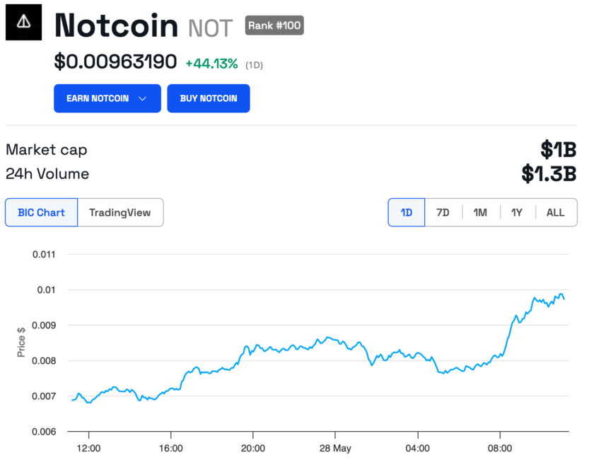 Saat ini, NOT diperdagangkan seharga US$0,009631, menempatkan dirinya di antara top 100 kripto berdasarkan kapitalisasi pasar. Yang lebih mengejutkan, volume perdagangan 24 jam NOT melambung tinggi ke angka US$1,3 miliar. Raihan ini mewakili kenaikan sebesar 231,28% dari hari sebelumnya.