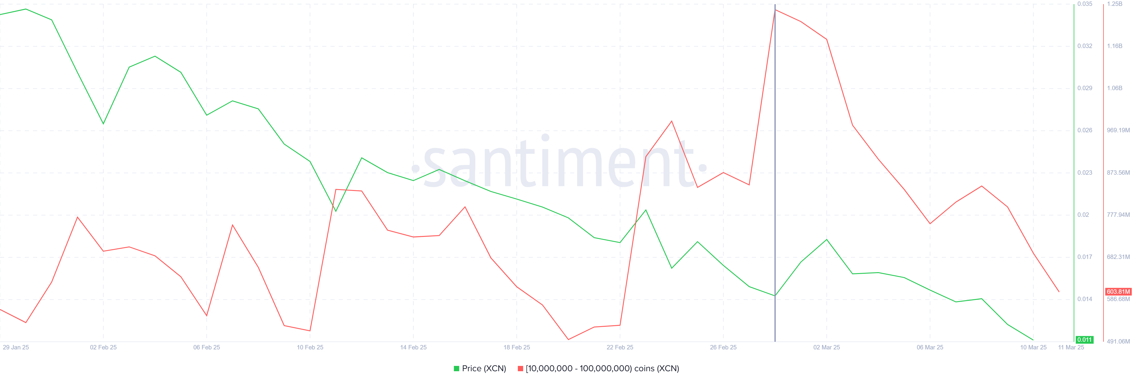 Alamat whale yang memegang antara 10 juta hingga 100 juta XCN telah menjual lebih dari 50% dari kepemilikan mereka, mengakibatkan pengurangan signifikan dalam posisi mereka. Penjualan ini membuat jumlah Onyxcoin yang dipegang oleh para whale ini turun dari 1,24 miliar XCN menjadi 603 juta XCN, setara dengan sekitar 637 juta XCN yang terjual, senilai US$76 juta. Penjualan besar-besaran dari pelaku pasar berpengaruh ini adalah tanda bearish, karena tindakan mereka sering mendorong investor ritel untuk mengikuti, khawatir akan penurunan lebih lanjut.
