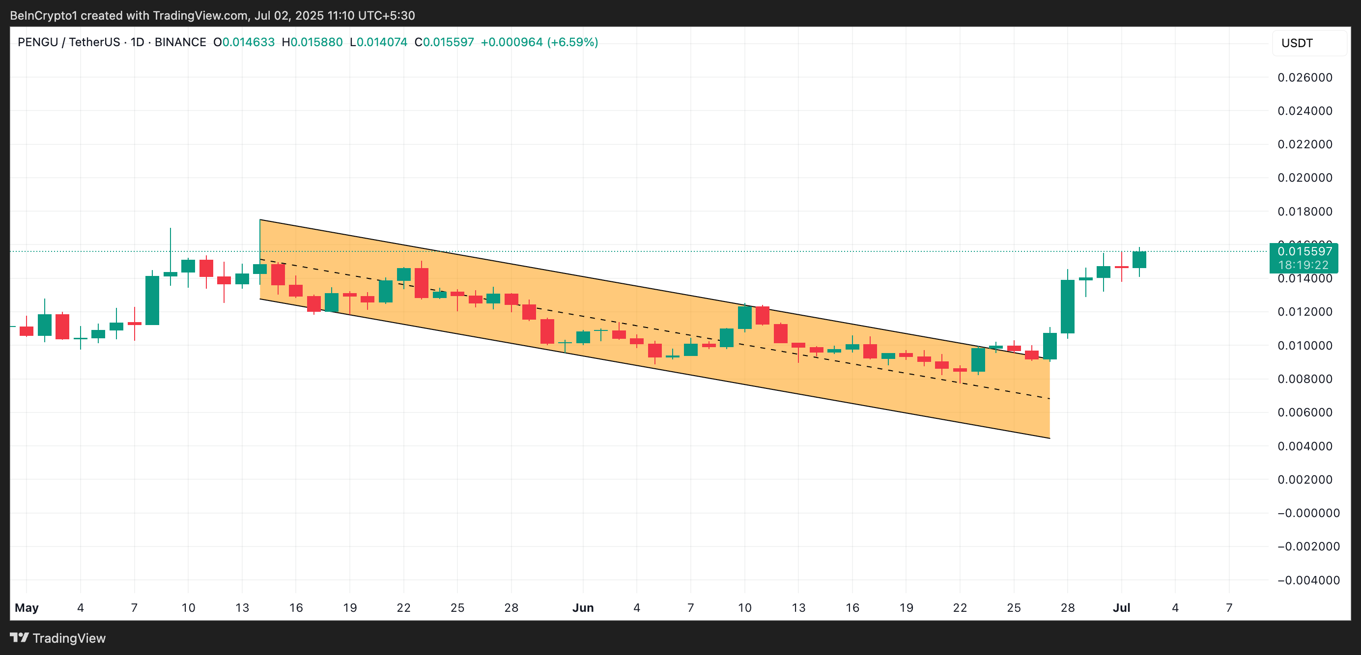 Namun, situasi berubah pada 27 Juni ketika PENGU ditutup di atas channel ini dan memulai reli setelahnya. Sekarang diperdagangkan pada US$0,015, harga meme coin ini telah naik 50% sejak saat itu.