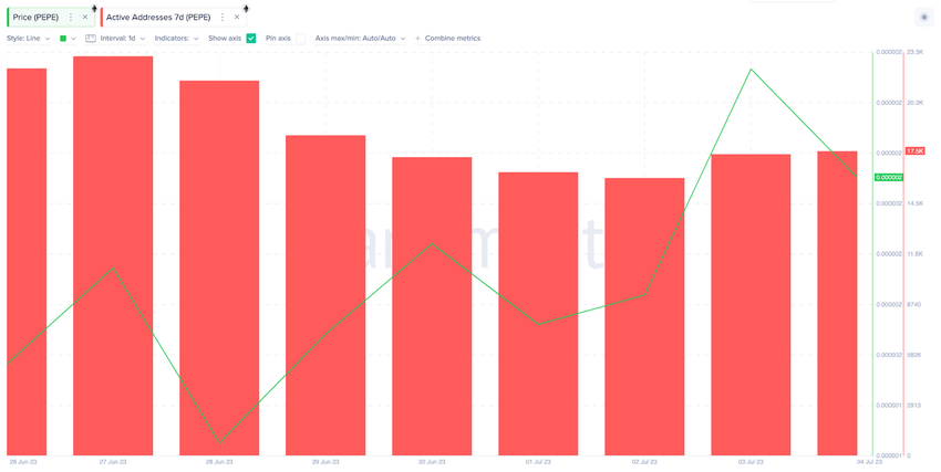 Seperti yang tersaji di bawah ini, harga PEPE telah melesat 16% antara tanggal 28 Juni dan 4 Juli. Namun, analisis mendalam tentang data alamat aktif harian PEPE menunjukkan bahwa aktivitas pengguna telah melambat sebesar 24%.