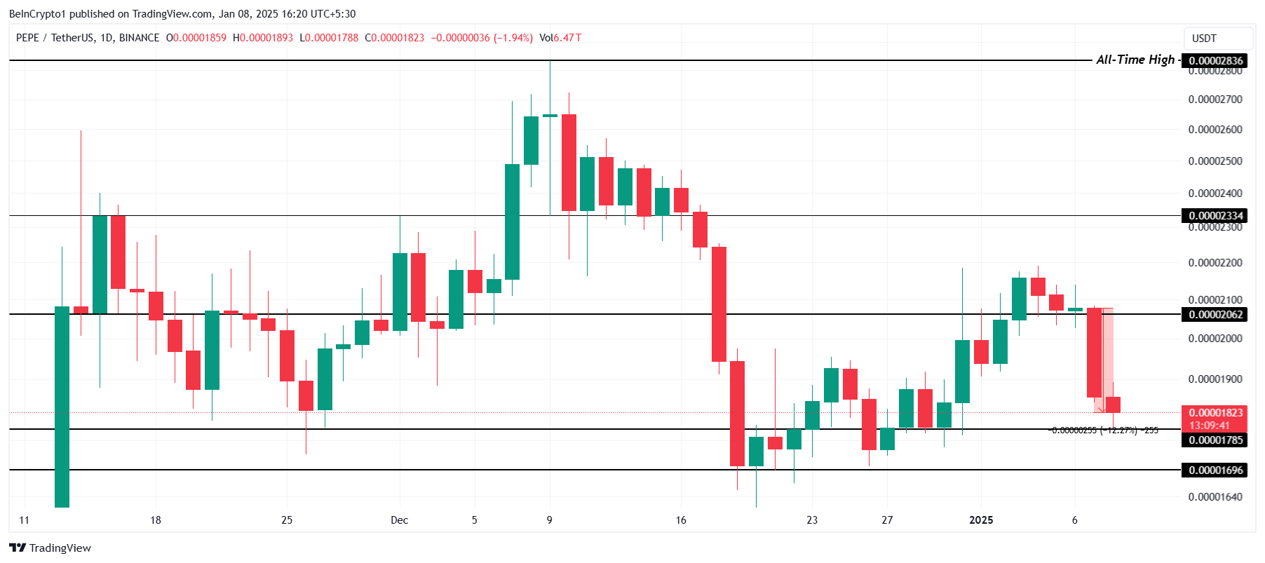 PEPE saat ini diperdagangkan pada US$0,00001823 setelah turun 12% dalam sehari terakhir. Penurunan ini terjadi setelah koin kehilangan level dukungannya di US$0,00002062, menyoroti dampak dari lingkungan pasar yang bearish.