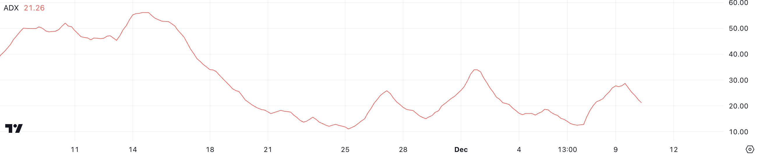 Selama ADX tetap di atas 20, tren masih dianggap memiliki kekuatan. Namun, penurunan ADX menunjukkan bahwa harga mungkin tidak akan terus naik sekuat sebelumnya dalam waktu dekat.