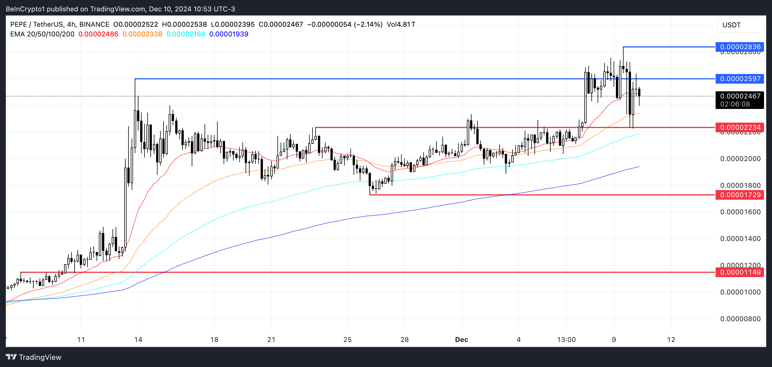 Tren naik yang memudar dikombinasikan dengan posisi harga PEPE di bawah EMA jangka pendek menunjukkan peningkatan tekanan ke bawah dalam waktu dekat.