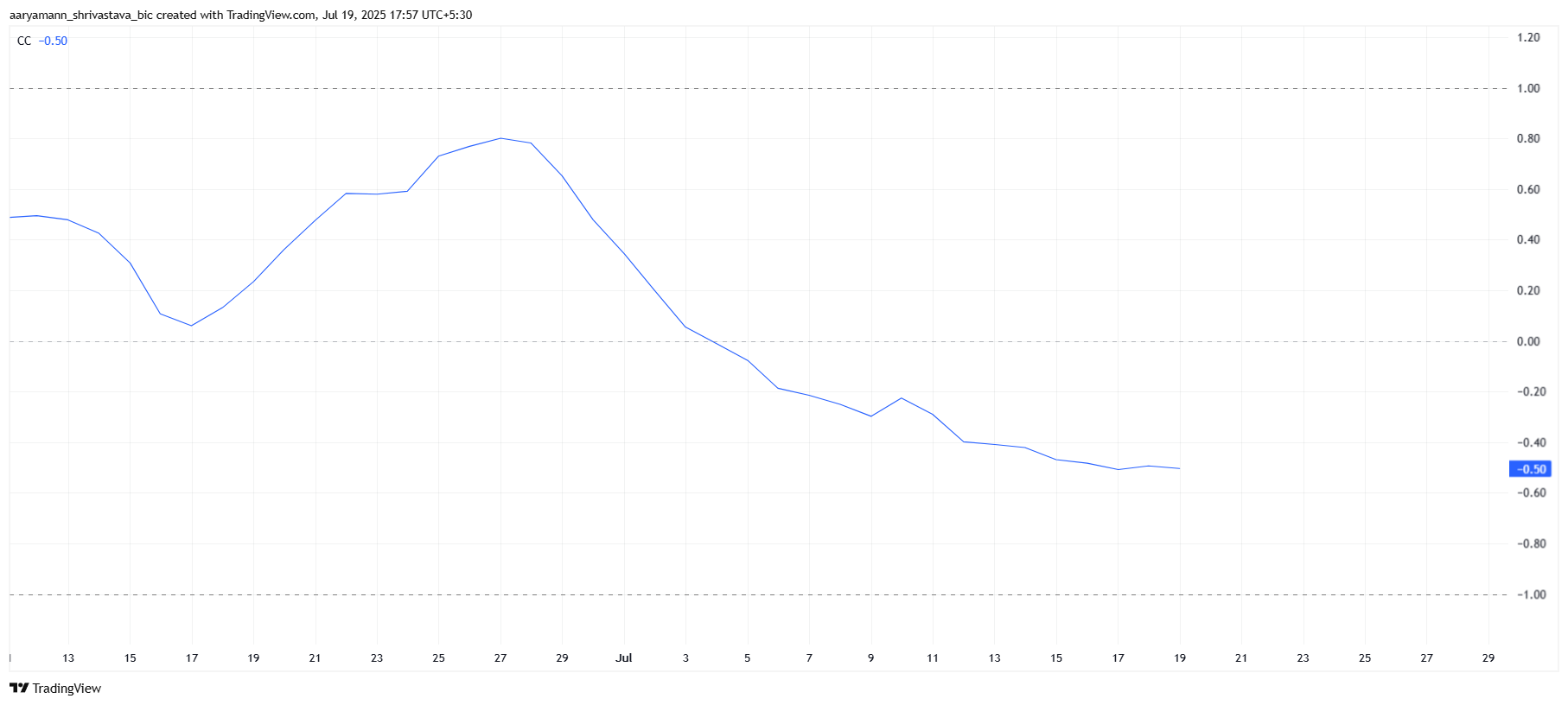 Korelasi Pi Coin dengan Bitcoin, faktor penting bagi banyak altcoin, terus menurun. Saat ini, korelasi Pi Coin berada di -0,50, artinya bergerak berlawanan arah dengan Bitcoin.