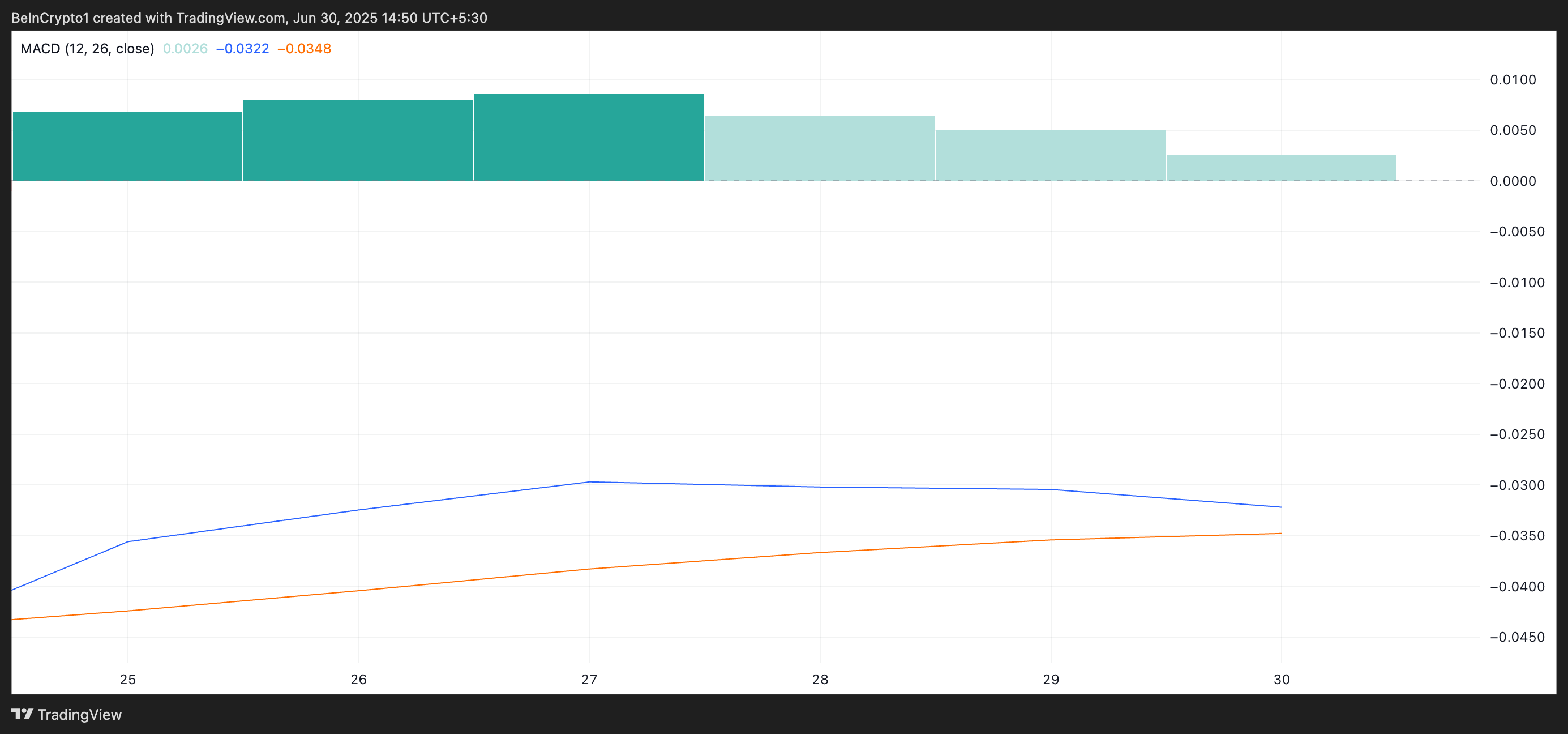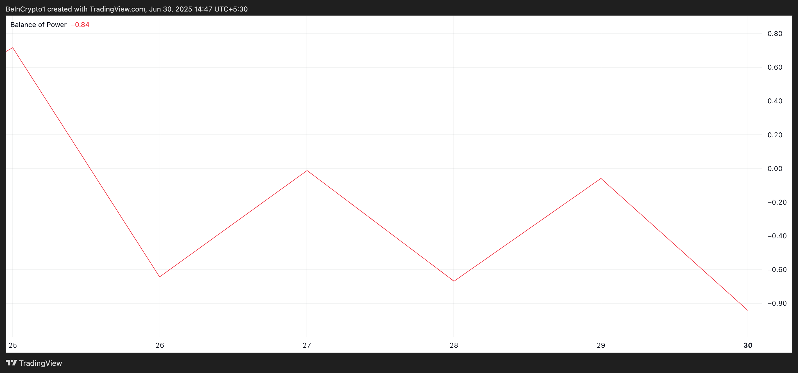 Sebaliknya, bacaan BoP negatif menandakan bahwa penjual mendominasi pasar, dengan sedikit atau tidak ada perlawanan dari pembeli. Ini mengonfirmasi tekanan turun yang berkelanjutan dan melemahnya kepercayaan investor.