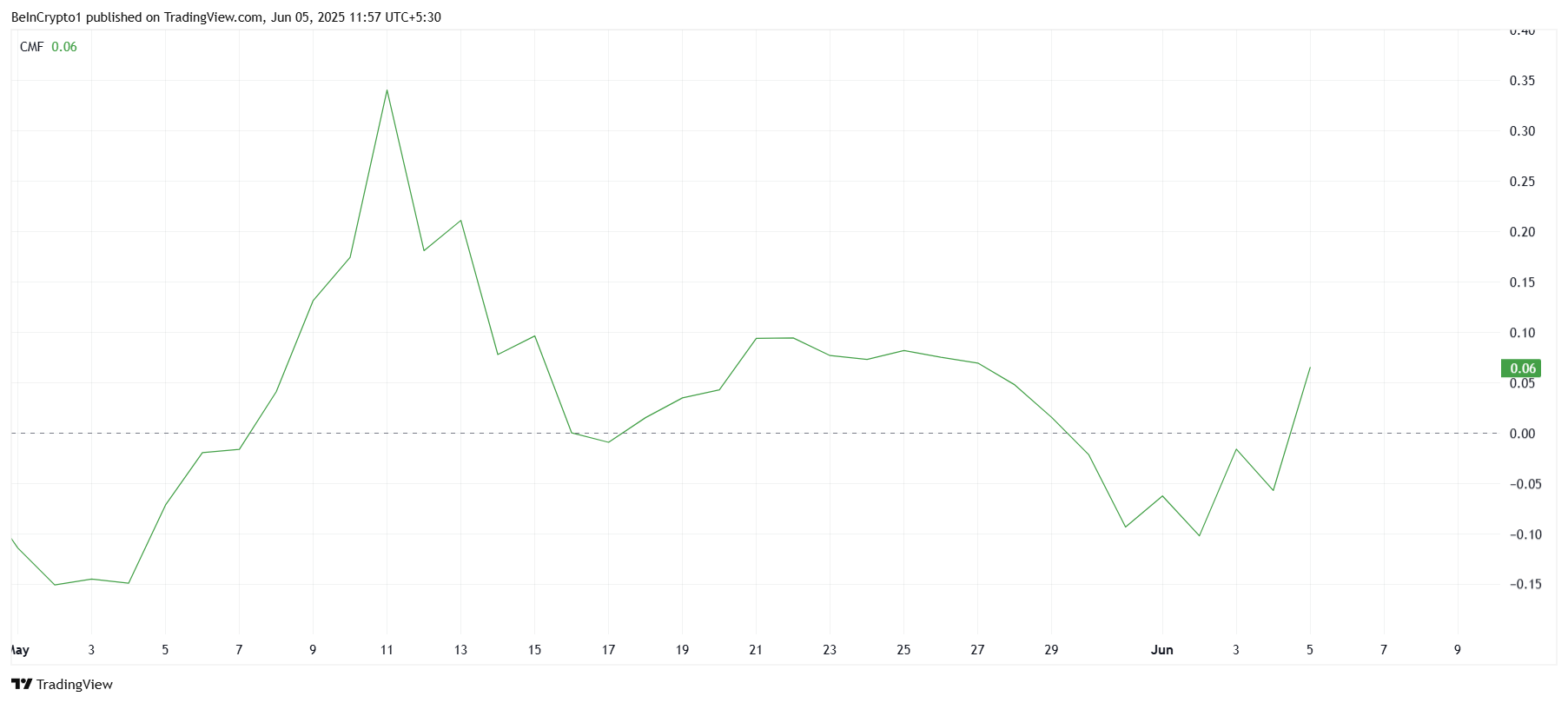 Indikator Chaikin Money Flow (CMF) menunjukkan tanda-tanda peningkatan, yang mengisyaratkan adanya aliran masuk ke Pi Network setelah hampir seminggu aktivitas investor yang rendah. CMF berada di atas garis nol, menandakan bahwa investor mulai kembali percaya pada potensi pemulihan.