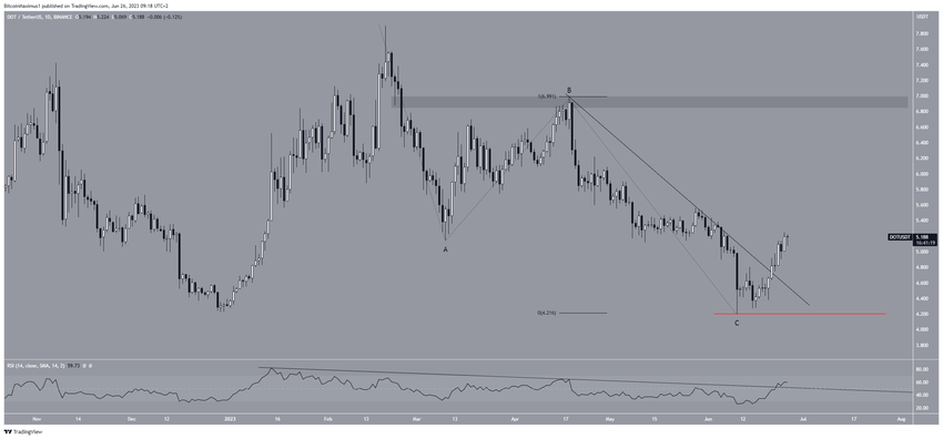 Harga Polkadot telah ambrol di bawah garis descending resistance sejak bulan Mei 2022. Garis ini telah menyebabkan banyak aksi penolakan, yang terakhir kali terjadi pada 17 April 2023. Akibatnya, penolakan tersebut mempercepat penurunan harga DOT dan menyebabkan terbentuknya level terendah tahunan baru di level US$4,20 pada bulan Juni.