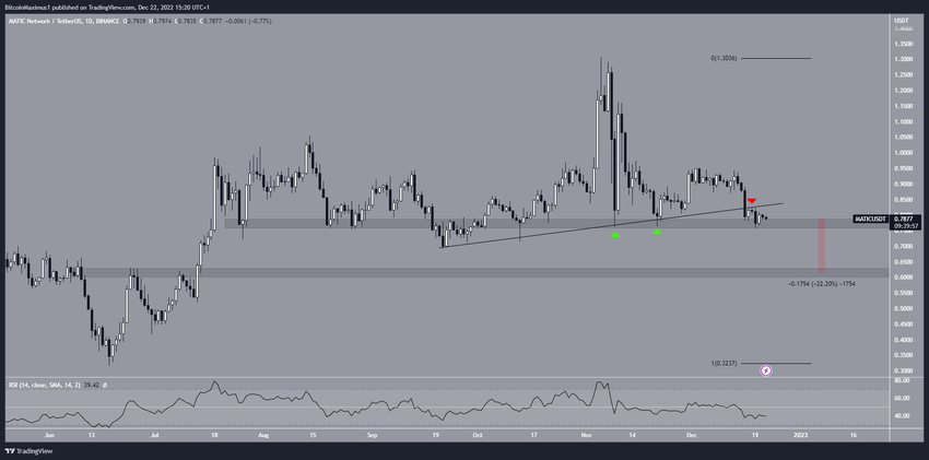 Harga Polygon (MATIC) terpantau telah menukik sejak mencapai level tertingginya di level US$1,30 pada 5 November lalu. Awalnya, harga MATIC memantul pada garis ascending support (ikon hijau), dan aksi ini mengantarkannya pada reli jangka pendek. Tapi, harganya menjebol garis tersebut pada 16 Desember dan memvalidasinya sebagai titik resistance di hari berikutnya.