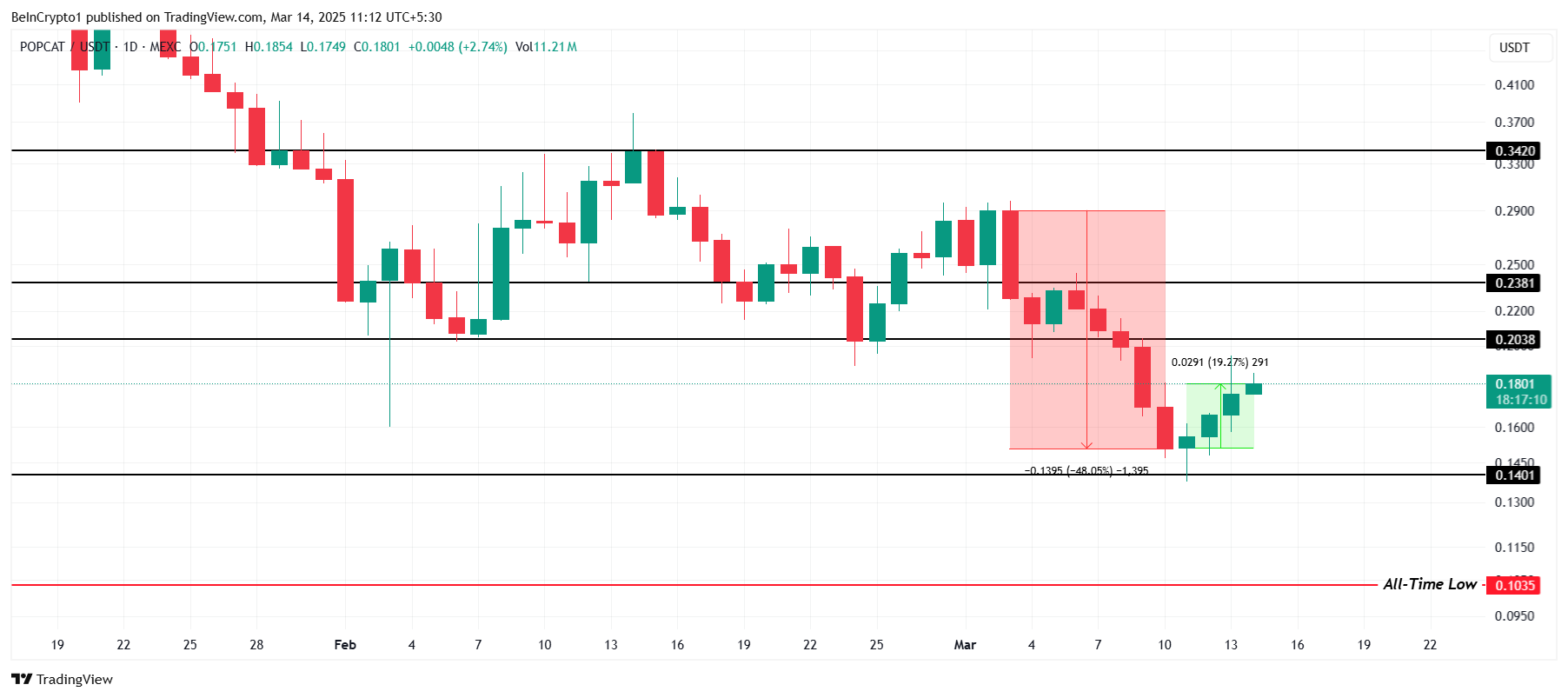 Mengingat kondisi pasar yang lemah dan sentimen investor, POPCAT bisa kesulitan untuk menembus resistance US$0,203. Altcoin ini lebih mungkin untuk berkonsolidasi dalam kisaran US$0,140 hingga US$0,203, setidaknya sampai petunjuk pasar yang lebih kuat muncul. Kondisi tersebut bisa semakin menunda potensi pemulihan.