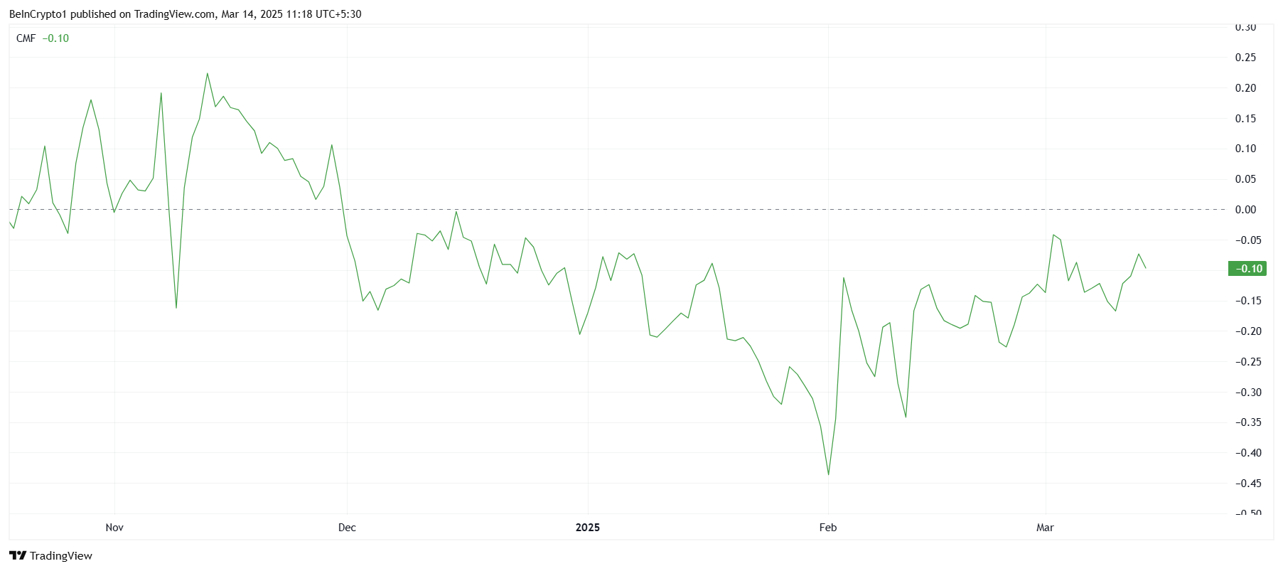 Indikator Chaikin Money Flow (CMF) tetap terjebak di bawah garis nol selama tiga setengah bulan terakhir. Menunjukkan bahwa arus masuk ke POPCAT lemah sejak awal Desember 2024, dengan sedikit minat beli. Kurangnya keyakinan investor lantaran takut mengalami rugi berkontribusi pada kurangnya momentum. Sehingga meme coin ini tidak mengalami pemulihan.