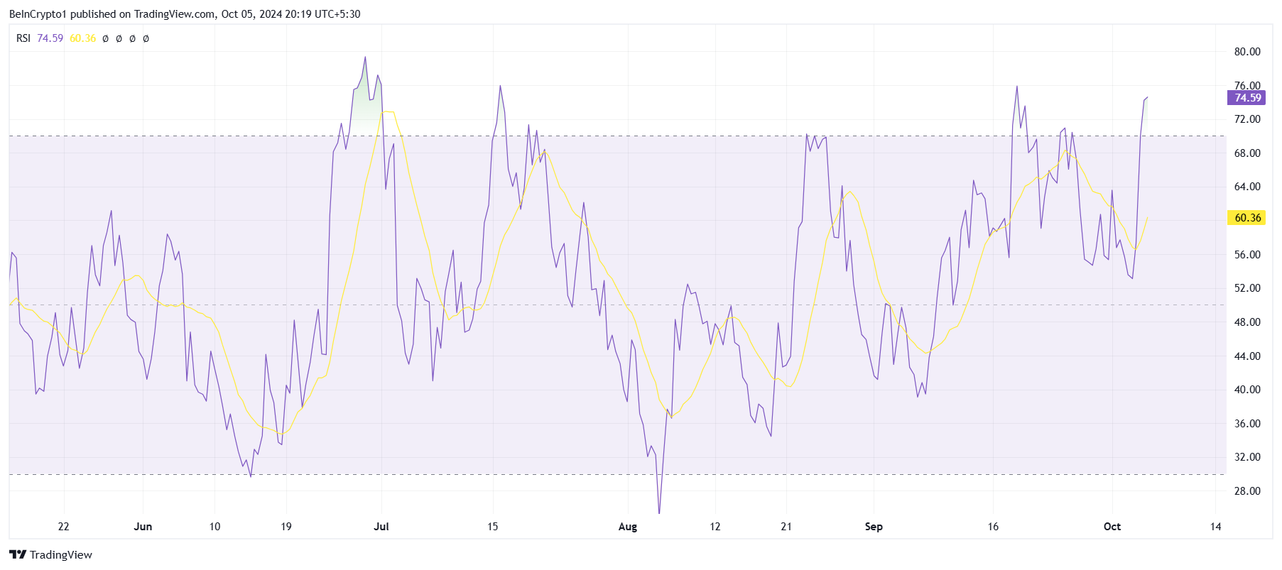 Dari perspektif teknis, momentum makro POPCAT tetap kuat. Indeks Kekuatan Relatif (RSI), indikator penting untuk menilai kondisi overbought atau oversold, saat ini berada di zona yang pertama. Meskipun demikian, RSI masih terus naik, menandakan bahwa tekanan beli tetap kuat untuk POPCAT.