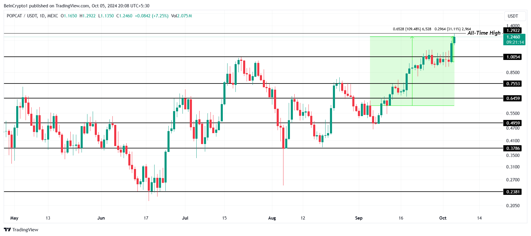 POPCAT, sebuah meme coin Solana, telah mencapai rekor tertinggi baru (ATH) setelah mengalami kenaikan signifikan. Koin ini melonjak sebesar 109% selama bulan lalu, menembus batas resistensi krusial US$1,00 dan mencapai US$1,29.