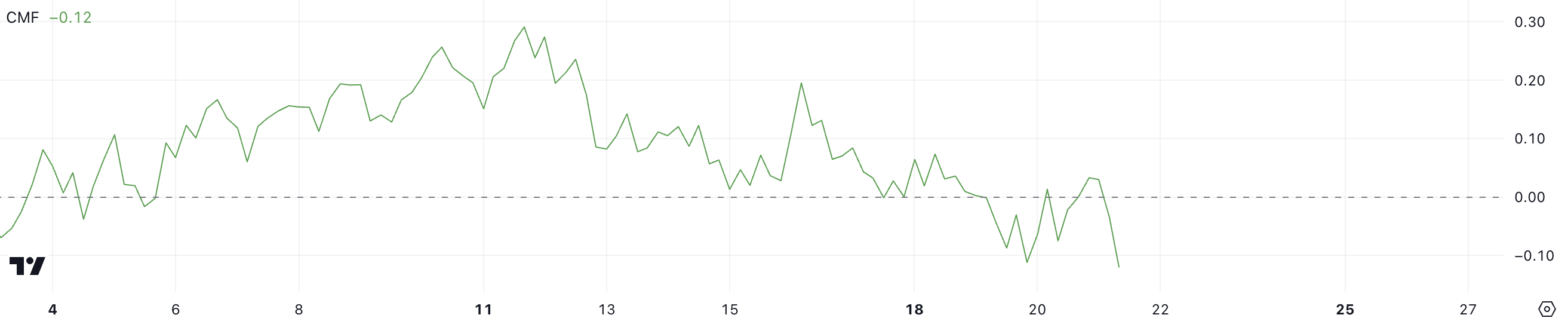 XRP Chaikin Money Flow (CMF) saat ini berada di -0,12, setelah menunjukkan level positif antara 5 November dan 19 November. Ini juga merupakan level terendahnya sejak 31 Oktober. Pergeseran ke wilayah negatif ini mencerminkan peningkatan tekanan jual dan potensi arus keluar modal dari aset tersebut.