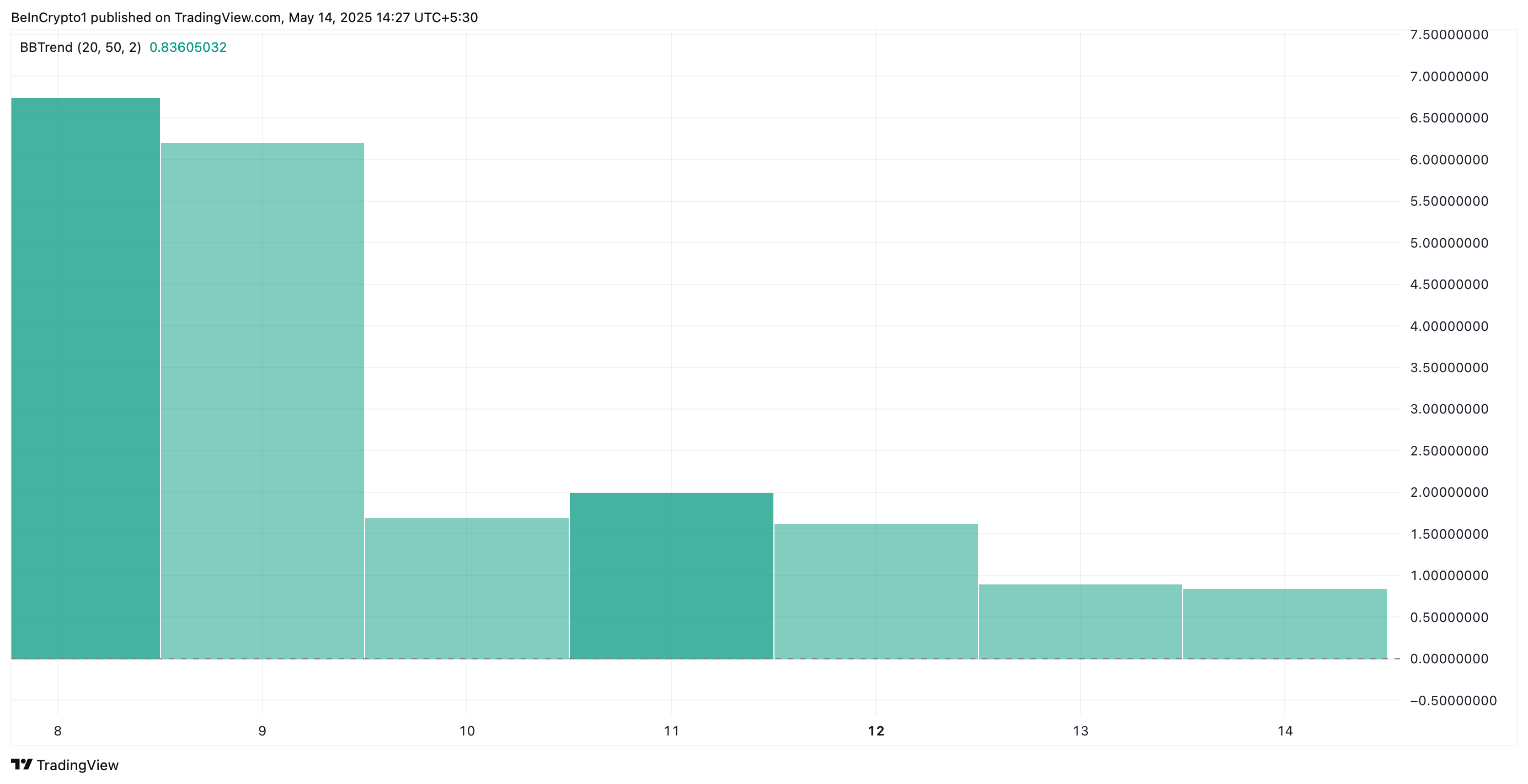 BBTrend menunjukkan kapan sebuah aset mengalami pergerakan naik atau turun yang berlebihan. Ketika ukuran batang hijau berkurang, momentum beli melemah.